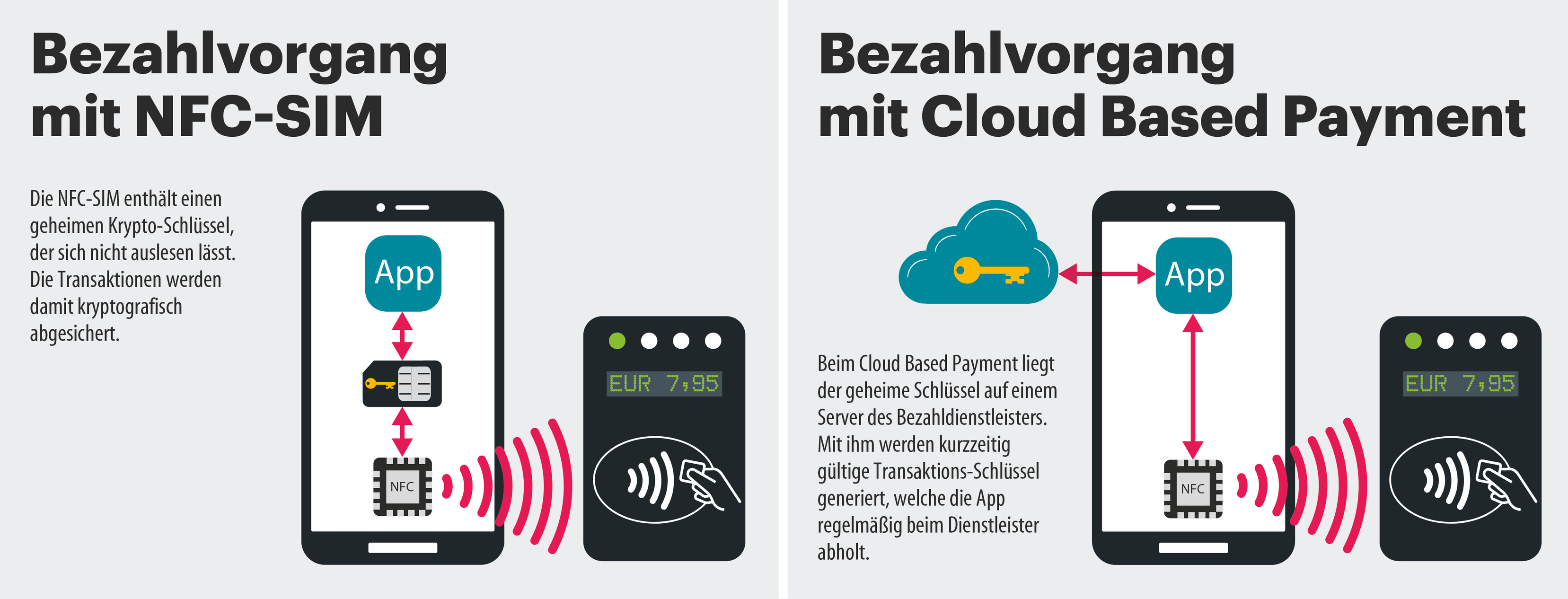 Das Vertrauensproblem wird auf völlig unterschiedliche Weisen gelöst: Am naheliegendsten ist der Ansatz, das Smartphone mit einem Secure Element in Hardware-Form zu bestücken – zum Beispiel durch eine neue SIM-Karte, die neben den üblichen Funktionen auch als Secure Element für kontaktlose Bezahlvorgänge arbeitet. Auch wenn diese SIM-Karten missverständlich als NFC-SIM bezeichnet werden, können sie keinesfalls direkt über NFC mit dem Bezahlterminal kommunizieren. Stattdessen nutzen sie die NFC-Schnittstelle des Smartphones. Die Apple-Geräte sind seit dem iPhone 6 bereits mit einem Secure Element ausgestattet, welches von Apple Pay genutzt wird. Auch die Apple Watch ist vorbereitet.