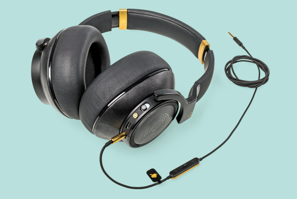 Der Kopfhörer fällt eher wuchtig aus; angesichts des Gebotenen hat er dafür aber eine gute Ausrede. An jeder Hörmuschel befindet sich ein Drehregler: Der linke hebt die Bässe und Höhen in drei Stufen an, der rechte steuert die Lautstärke des internen Verstärkers.