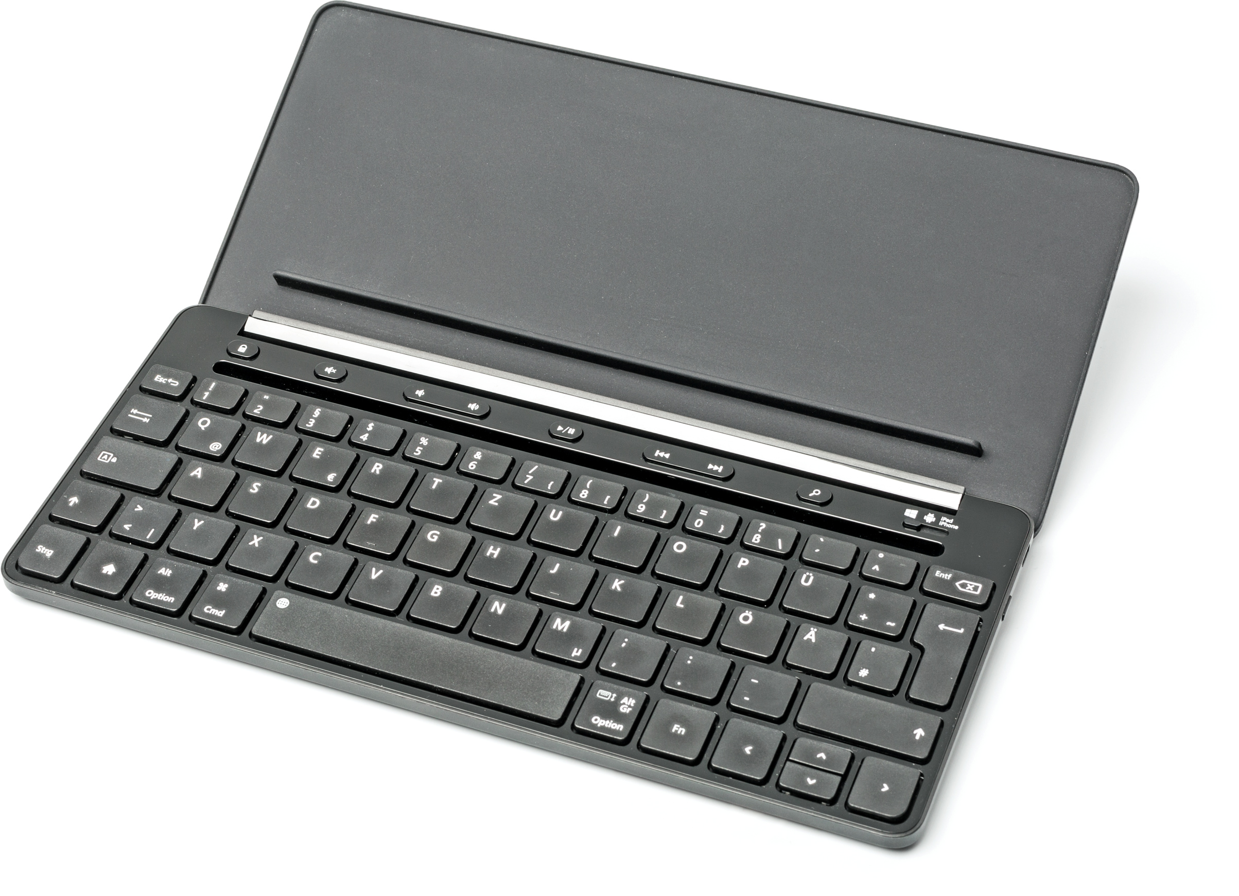 Microsofts „Universal Mobile Keyboard“ hat einen abnehmbaren, magnetisch haltenden Deckel mit Smartphone- und Tablet-Halterung. Er lässt sich so in ergonomischer Entfernung zur Tastatur aufstellen und hält auch schwere Tablets vom Kaliber eines iPad Pro sicher. Die Tasten haben einen angenehmen Anschlag und sind sinnvoll angeordnet. Zehnfingerschreiber kommen trotz 16,5-mm-Raster gut zurecht.