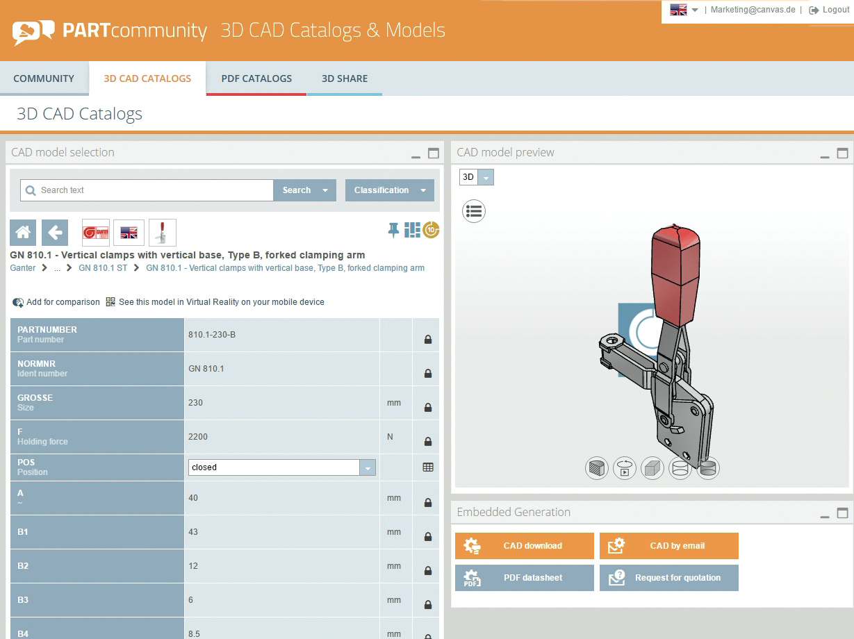 Im Downloadportal PARTcommunity 6.0 von Cadenas finden sich CAD-Daten der Maschinenbaukomponenten von mehr als 400 Herstellern. Die Entwickler haben die Kacheln und die Bilder der CAD-Modelle vergrößert, zudem passt sich das Layout nun mit Responsive Design automatisch an die Displaygröße von Mobilgeräten an. Modelle lassen sich jetzt einfacher als zuvor herunterladen: Auf der Bildschirmseite, in der sich der Anwender registriert, kann er ein oder mehrere CAD-Formate auswählen, ein 3D-PDF-Datenblatt anfordern und schließlich alle Daten im Zip-Format herunterladen. Komponentenhersteller haben nun die Gelegenheit, QR-Codes für ihre Produkte zu hinterlegen, sodass mobile Nutzer direkt per Scan zur Produktseite gelangen.