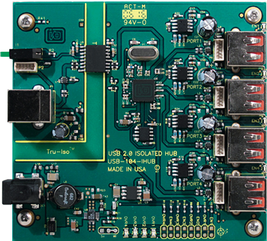 Der USB-104-IHUB erfüllt laut Hersteller Acces die hohen Anforderungen an die elektrische Betriebssicherheit von medizinischen, militärischen und industriellen Anwendungen. Up- und Downstream-Bereich sind auf der Platine des Hubs mit einem Überspannungsschutz bis 4 kV voneinander isoliert. Zum Anschluss externer Geräte hat der Hub vier USB-Ports, von denen jeder mit einem eigenen Kurzschlussschutz ausgestattet ist. Fällt ein Peripheriegerät durch einen Fehler aus, entkoppelt die Schutzschaltung den betroffenen Port vom Rest des Hubs, sodass andere Geräte problemlos weiter funktionieren. Der Nutzer wird über eine aufleuchtende LED am jeweiligen Port über eine Fehlfunktion aufmerksam gemacht.