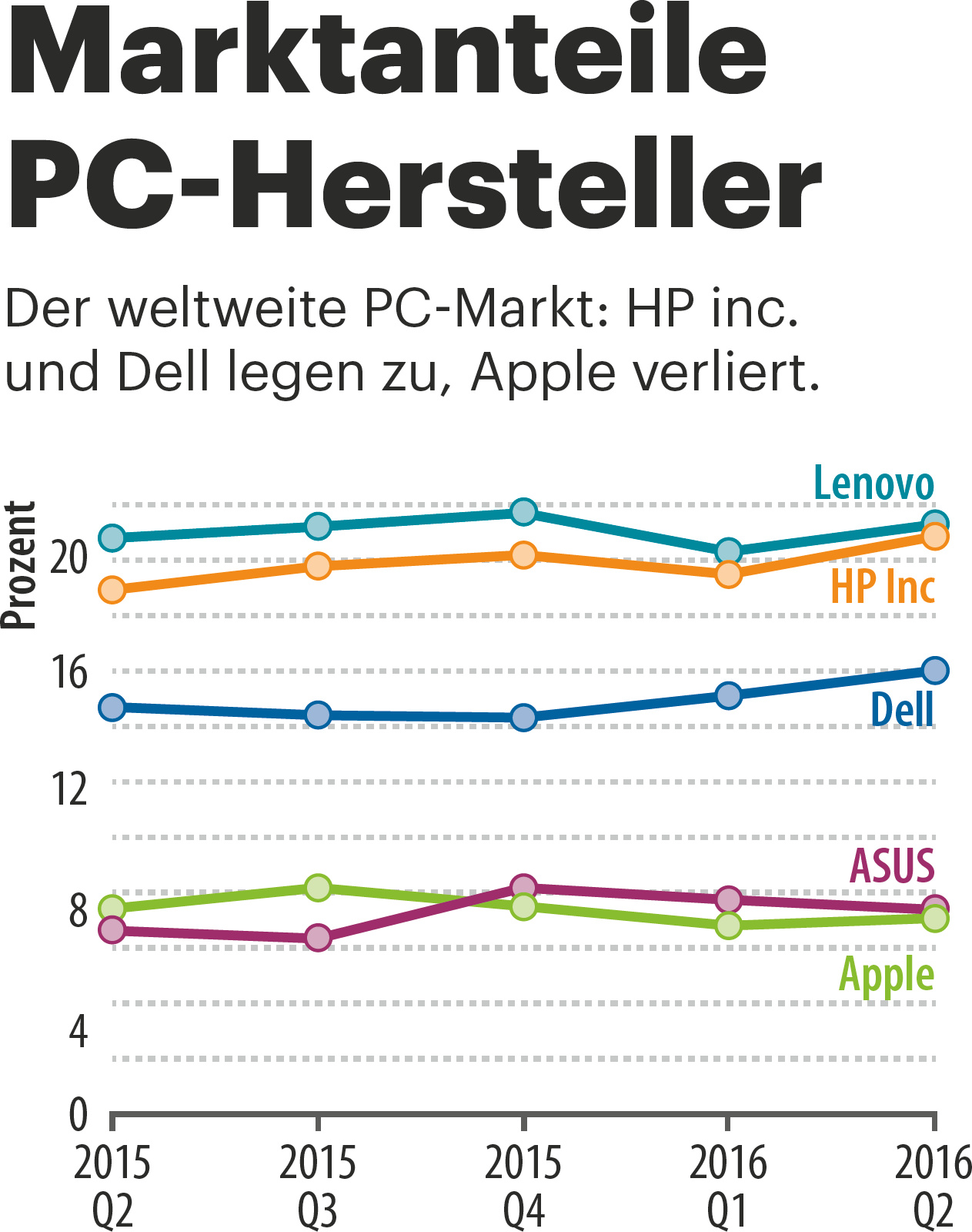 Fakt ist jedenfalls, dass die Macs insgesamt Marktanteile verloren haben. Laut IDC sind es weltweit mit nunmehr 4,42 Millionen Stück 8,3 Prozent weniger Verkäufe als im zweiten Quartal 2015. Dabei muss man aber berücksichtigen, dass der PC-Markt in dieser Zeit insgesamt 4,5 Prozent verloren hat, was immerhin drei Prozentpunkte besser ist als vorhergesagt. Die direkten Konkurrenten wie HP Inc., Dell und Asus konnten gegen den Trend um 4 bis 5 Prozent zulegen.