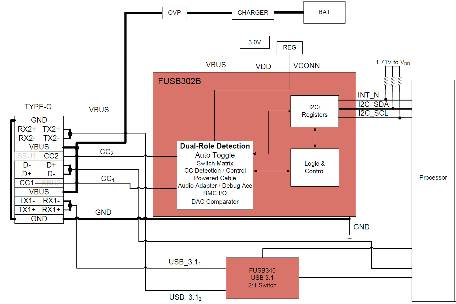 Der quadratische FUSB302B hat 2,5 mm Kantenlänge und ist per I2C programmierbar, um Änderungen der Spezifikation leicht einpflegen zu können. Er ermöglicht Ladefunktionen gemäß Version 1.2 der Spezifikation für USB Power Delivery (USB PD 1.2). Er wertet auch Informationspakete aus, die systemspezifische USB-Typ-C-Netzteile senden; diese können digitale Signaturen enthalten, um den Anschluss fremder Netzteile zu verhindern beziehungsweise dann nur mit geringer Leistung zu laden, um Überlastung zu vermeiden.