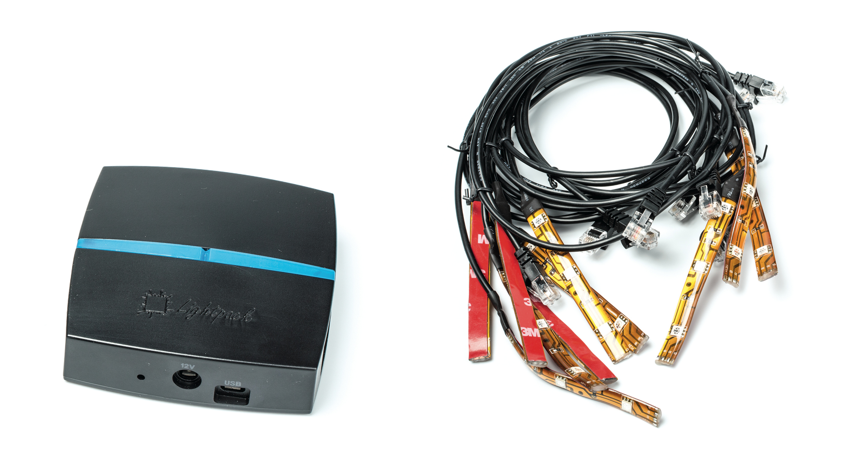 Das Set besteht aus einer kleinen USB-Box und zehn selbstklebenden LED-Modulen, die mit jeweils drei parallel angesteuerten RGB-LEDs bestückt sind. In der Box steckt ein LED-Controller, gleichzeitig übernimmt sie die Spannungsversorgung für die Lichtstreifen.