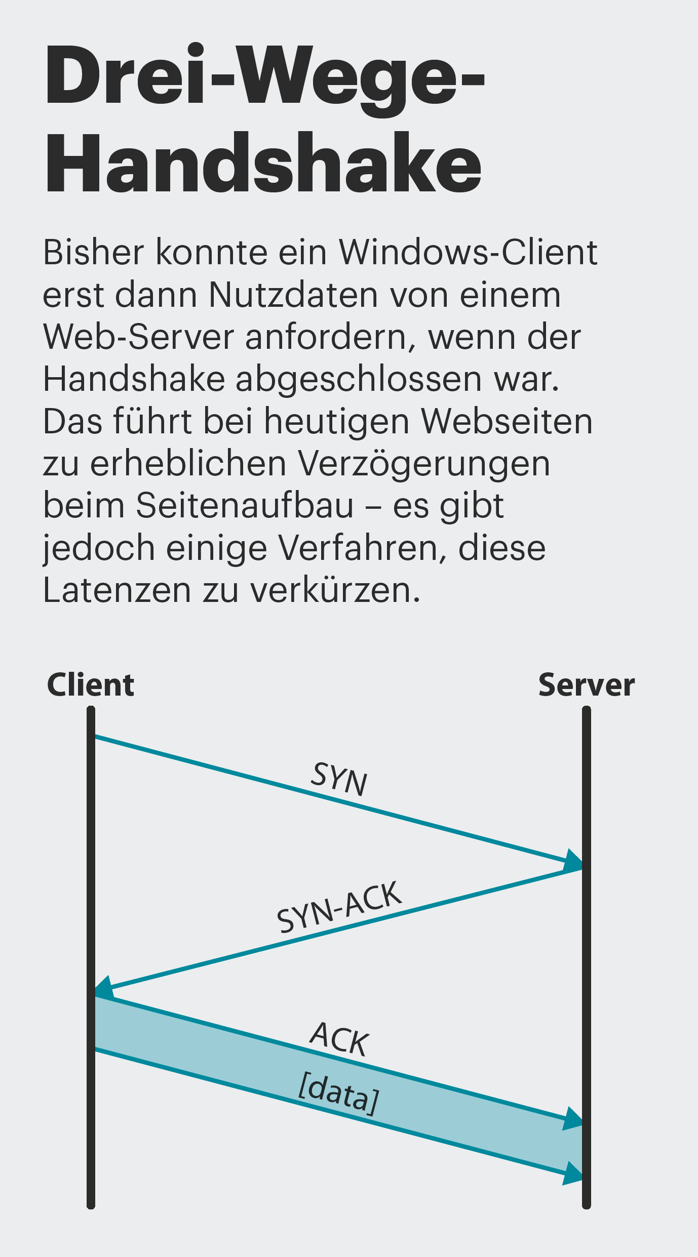 Auch Webbrowser dürfen im SYN-Paket Nutzdaten mitschicken, und zwar für den ersten HTTP-Request. Das ist jedoch nur für HTTP-Requests erlaubt, die wiederholt werden dürfen, denn der Browser darf sich nicht darauf verlassen, dass das Betriebssystem auf der Server-Seite im SYN gelieferte Nutzdaten zum Webserver hinaufreicht. Davon profitieren also Anwendungen wie CSS oder JavaScript, deren HTTP-Requests Clients wiederholen dürfen.