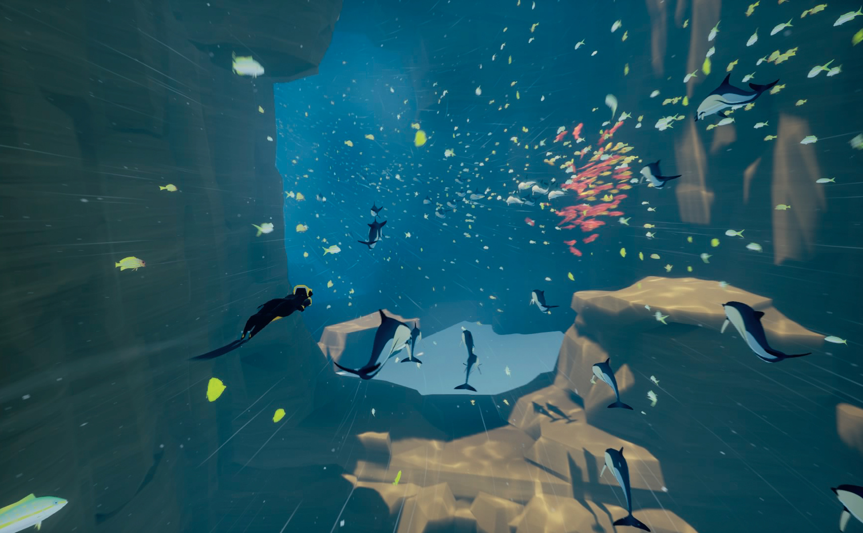 Das Erkundungsspiel Abzu lädt Spieler ein, durch prächtige Meereswelten zu tauchen, Ruinen und futuristische Apparaturen zu erkunden sowie den Zauber der Meeresfauna und -flora zu genießen. Dabei kann man sich beliebig Zeit lassen und muss auch keine Angst haben, von Haien gefressen zu werden.