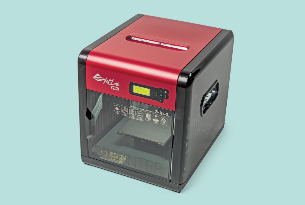 Als „3in1“-Gerät preist XYZPrinting sein jüngstes 3D-Druckermodell Da Vinci Pro 1.0 an. In der 800 Euro teuren Grundausstattung enthält es einen 3D-Druckkopf und beherbergt gleichzeitig einen 3D-Scanner. Für die dritte Funktion, das Lasergravieren, benötigt man zusätzlich ein Lasermodul, das etwa 150 Euro kostet.