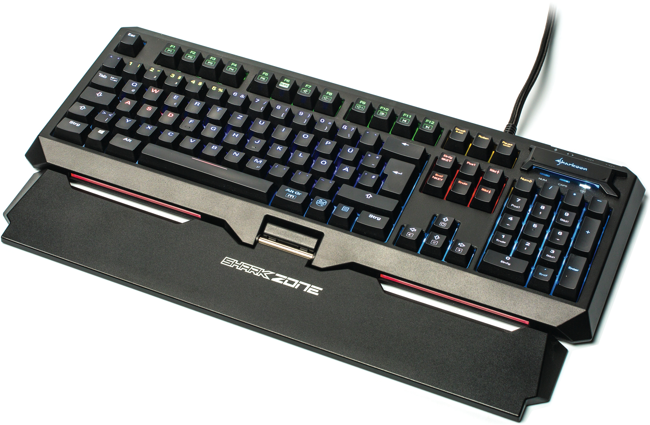 Die Shark Zone MK80 RGB wird mit einer breiten, ausklinkbaren Handballenauflage ausgeliefert. Das Tasten-Layout weicht nur an einer Stelle deutlich vom Standard ab: Zwischen AltGr und Kontextmenü liegt eine mit dem Herstellerlogo bedruckte Funktionstaste. Diese aktiviert die zusätzliche Belegung von F1 bis F12 und den Pfeiltasten.