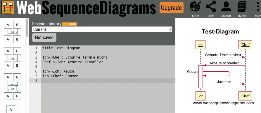 Sequenzdiagramme stellen Interaktion grafisch dar, etwa die verschlüsselte Kommunikation zwischen den bekannten Protagonisten Alice und Bob. Bei WebSequenceDiagrams erstellt man solche Grafiken in einem Online-Editor. Dieser zeigt drei Spalten. Die mittlere enthält einen Editor für die Beschreibung des Diagramms in UML (Unified Modeling Language). Diese Sprache muss man nicht erlernen, sondern kann die in der linken Spalte angezeigten Standardabfolgen zur gewünschten Sequenz kombinieren. Im Editor müssen dann nur noch die Beschriftungen angepasst werden. In der rechten Spalte ist das Diagramm zu sehen.