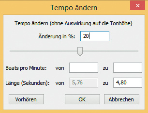 Das Effekt-Menü von Audacity bietet Möglichkeiten, um das Hörverständnis zu trainieren. Beim Lernen von Sprachen ist es generell sinnvoll, mit dem Effekt „Tempo ändern“ zu arbeiten. Mit diesem lässt sich die Geschwindigkeit von Audiodateien verlangsamen, ohne dass die Tonhöhe darunter leidet. Dafür markieren Sie die Audiospur und wenden den Effekt an. Tragen Sie bei „Änderung in %“ 20 Prozent ein – das ist für ein deutlich verbessertes Hörverständnis in der Regel ausreichend.