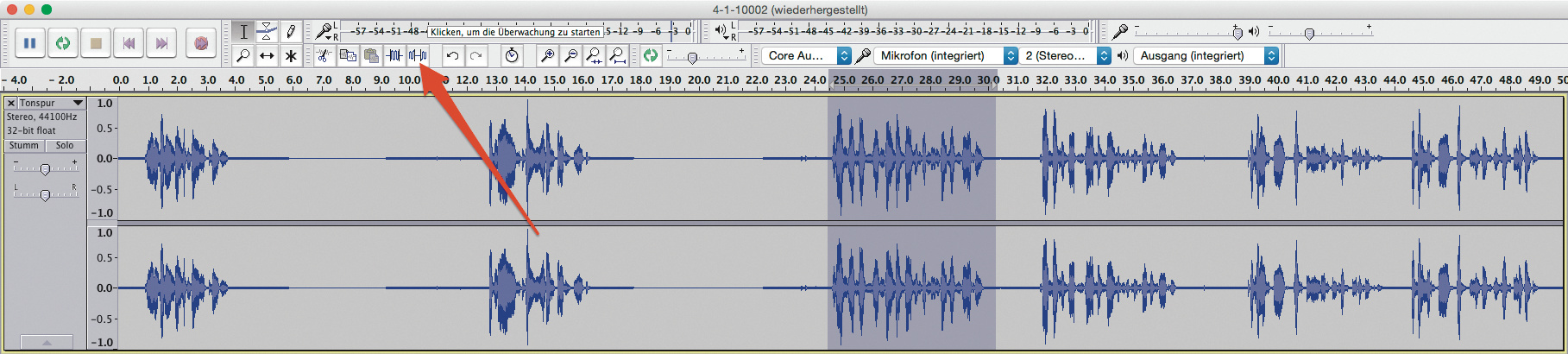 Öffnen Sie Audacity und prüfen Sie mit der Aussteuerungsanzeige, ob das Eingangssignal des Mikrofons laut genug ist. Ihre Aufnahme sollte nicht zu leise werden. Sie können sie zwar mit Effekten wie „Verstärken“ im Nachhinein lauter machen, doch das bedeutet, dass auch alle Nebengeräusche lauter werden und Ihre Aufnahme eventuell ruinieren. Sind die Audios zu leise, ist das Hören kein Vergnügen. Pegeln Sie das Eingangssignal bei ungefähr –9 dB ein. Dann haben Sie noch genug sogenannten Headroom bis zur 0 und können auch mal etwas lauter werden, ohne dass die Aufnahme gleich übersteuert.