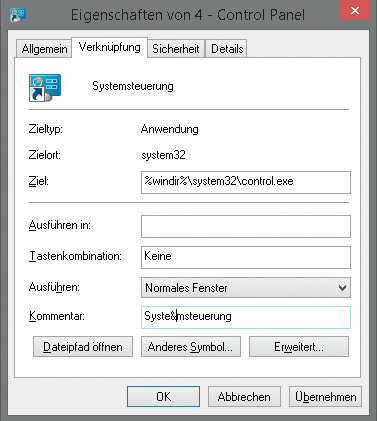 Öffnen Sie über einen Rechtsklick die Eigenschaften der Verknüpfung und tragen Sie dort im Karteireiter „Verknüpfung“ unter „Kommentar“ ohne Anführungsstriche „Syste&msteuerung“ ein und bestätigen Sie mit OK. Starten Sie anschließend den Windows Explorer über den Task-Manager (Strg+Umschalt+Esc) neu. Jetzt verwendet das Win-X-Menü nur noch für „Herunterfahren oder abmelden“ das Tastenkürzel „U“; die Systemsteuerung erreichen Sie mit „M“. (ghi@ct.de)
