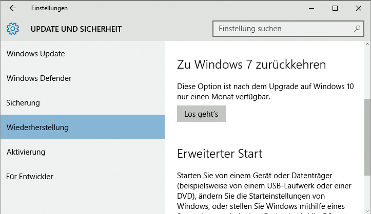 !!! Zumindest in den ersten 30 Tagen nach der Installation geht das mit Bordmitteln: Im Startmenü finden Sie unten einen Link zu den „Einstellungen“. Dort steckt unter „Update und Sicherheit/Wiederherstellung“ ein Abschnitt zum Zurückkehren zur vorherigen Windows-Version; auf einigen Systemen trägt er auch den irritierenden Namen „Zu früherem Build zurückkehren“. Nach einem Klick auf den dazugehörigen „Los geht’s“-Button wird Ihr altes Windows wiederhergestellt. Obacht: Nach 30 Tagen löscht Windows 10 das Backup der Vorversion automatisch, danach können Sie also nur noch mit selbst angefertigten Backups zurück. (axv@ct.de)