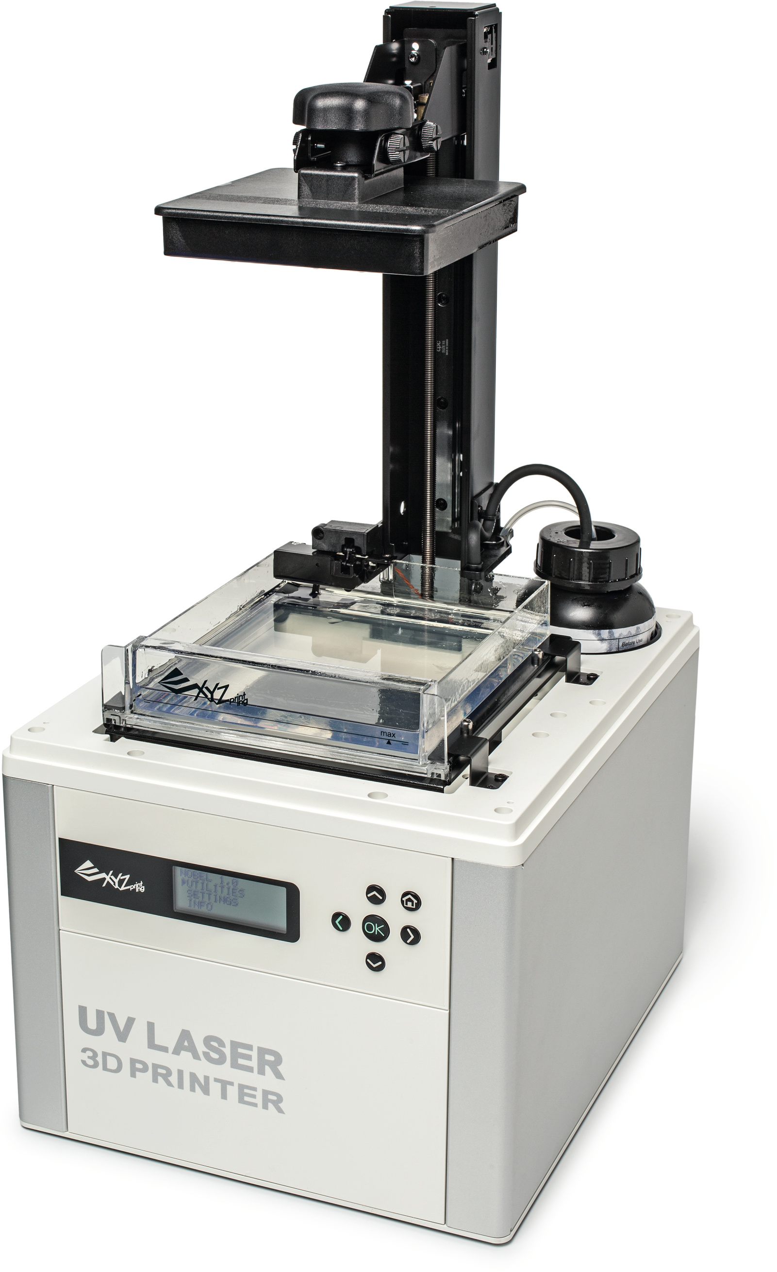 Beim Stereolitografie-Verfahren wird das Modell in einem Bad aus flüssigem Kunstharz mit einem Laserstrahl ausgehärtet und dabei langsam aus der Flüssigkeit herausgezogen. Das ermöglicht deutlich feinere Strukturen als im FDM-Verfahren, und Überhänge sind weniger problematisch. Dafür dauern die Drucke um einiges länger und die Handhabung des recht teuren Kunstharzes ist aufwendiger, weil man das Druckbad regelmäßig mit Alkohol reinigen muss. Das Kunstharz kostet beim Hersteller des Nobel 135 Euro pro Liter. Nach dem Druck ist es viel härter als ABS oder PLA und kann ähnlich wie Metall nachbearbeitet werden. Wo bei der Entwicklung von Prototypen hohe Präzision gefragt ist, ist ein Stereolithografie-Drucker eine Überlegung wert. Professionelle Geräte kosten allerdings deutlich mehr als das Einsteigermodell Nobel von XYZprinting.