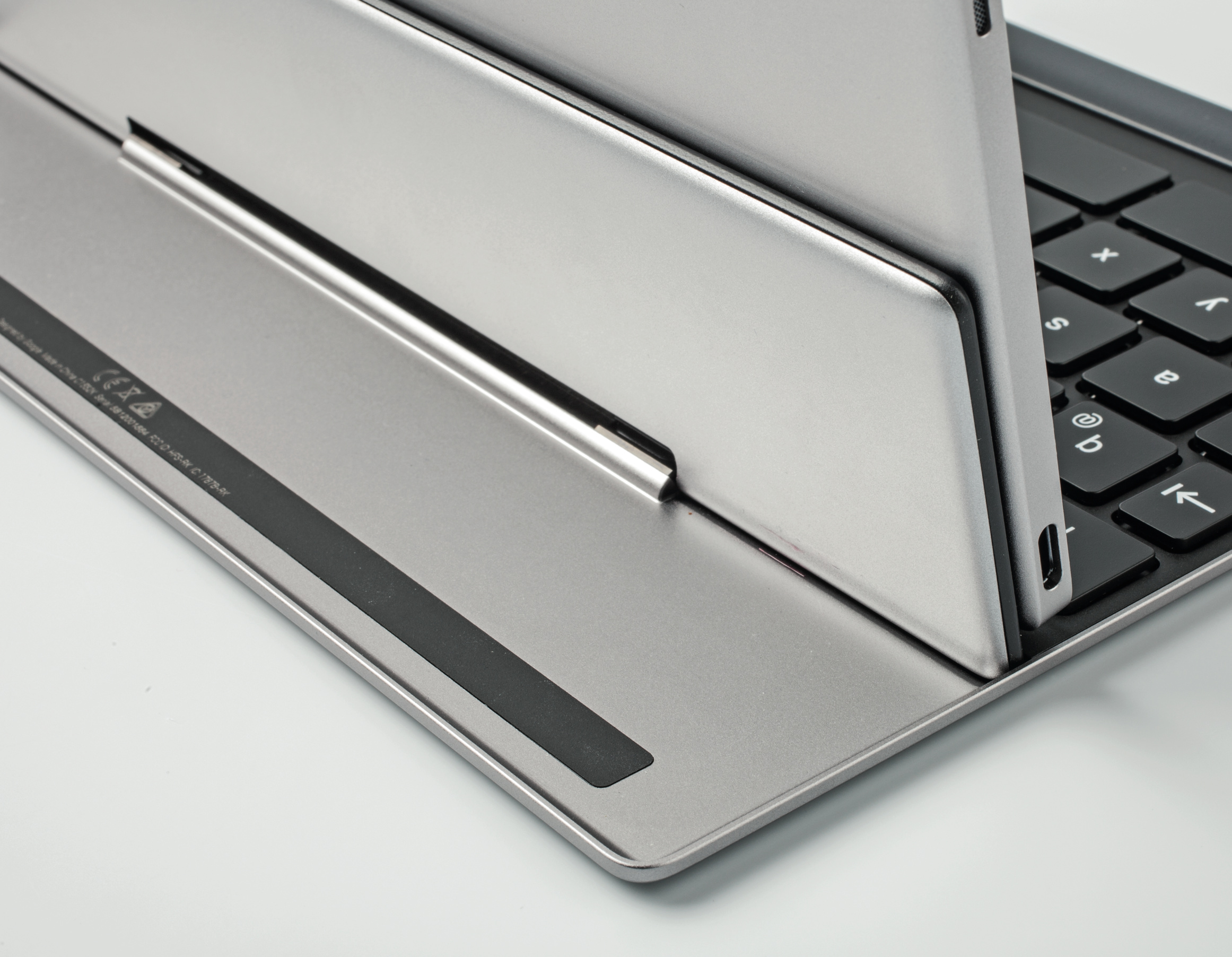 Das Tastatur-Dock kostet 169 Euro extra und ist mit 400 Gramm ziemlich schwer; es hat das gleiche Metall-Aussehen wie das Tablet. Verbinden lässt es sich über eine im Winkel verstellbare Schiene, die per Starkmagneten an das Tablet andockt. Das Tablet sitzt dann so fest, dass es auch beim Herumtragen nicht herausfallen kann. Der Aufstellwinkel ist wie bei einem Notebook beliebig einstellbar. Auch in sehr schräger Display-Lage steht das Tablet stabil und fällt selbst dann nicht um, wenn man es anschubst.