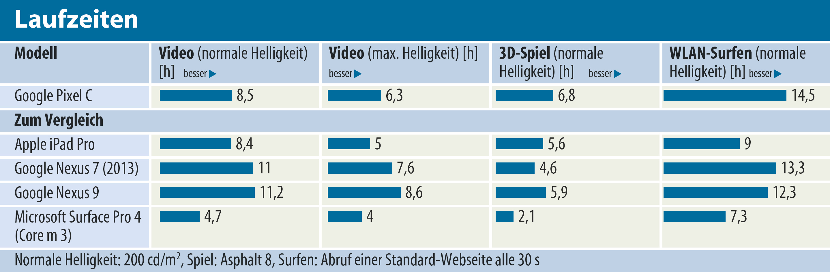 Speziell fürs Pixel C angepasste Notebook-Funktionen wie einen Splitscreen-Modus, mit dem man mehrere Apps nebeneinander betreiben könnte, gibt es nicht – er soll erst in der nächsten Android-Version Standard werden. Viele Apps aus dem Play Store laufen nur hochkant und werden dann im Notebook-Modus falsch dargestellt.