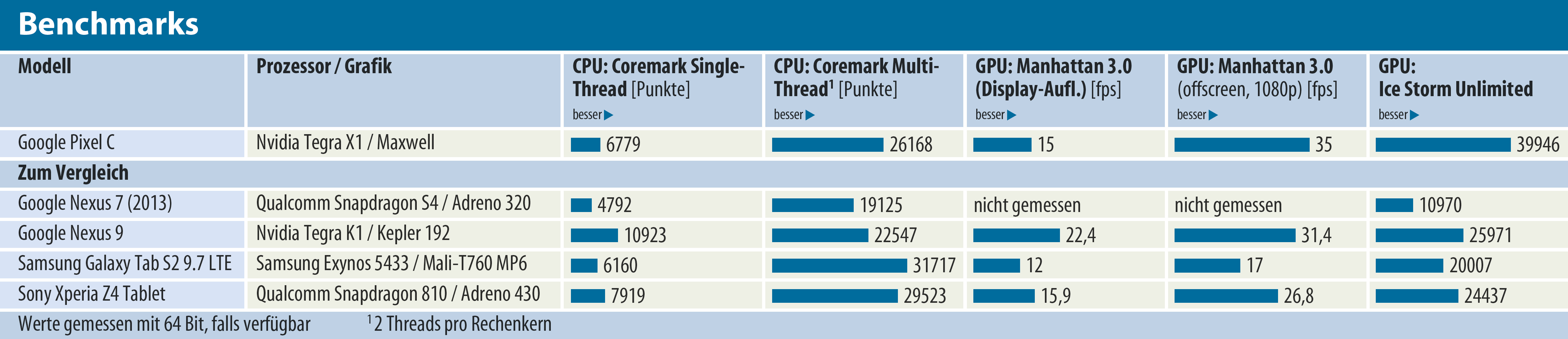 Das Pixel C ist eines der performantesten Tablets überhaupt. Der eingebaute Nvidia Tegra X1 sorgt für Tempo, Ruckler sind auf der Oberfläche kaum zu bemerken und selbst aufwendige Spiele wie GTA San Andreas laufen in der höchsten Grafikstufe tadellos. In den Spiele- und CPU-Benchmarks erzielt das Pixel C ähnliche Werte wie die aktuellen High-End-Prozessoren von Samsung und Qualcomm. Auch das Display ist Spitze: Das IPS-Panel ist schön scharf, leuchtet extrem hell, ist blickwinkelunabhängig und hat für ein LCD einen extrem hohen Kontrast von 1875:1.
