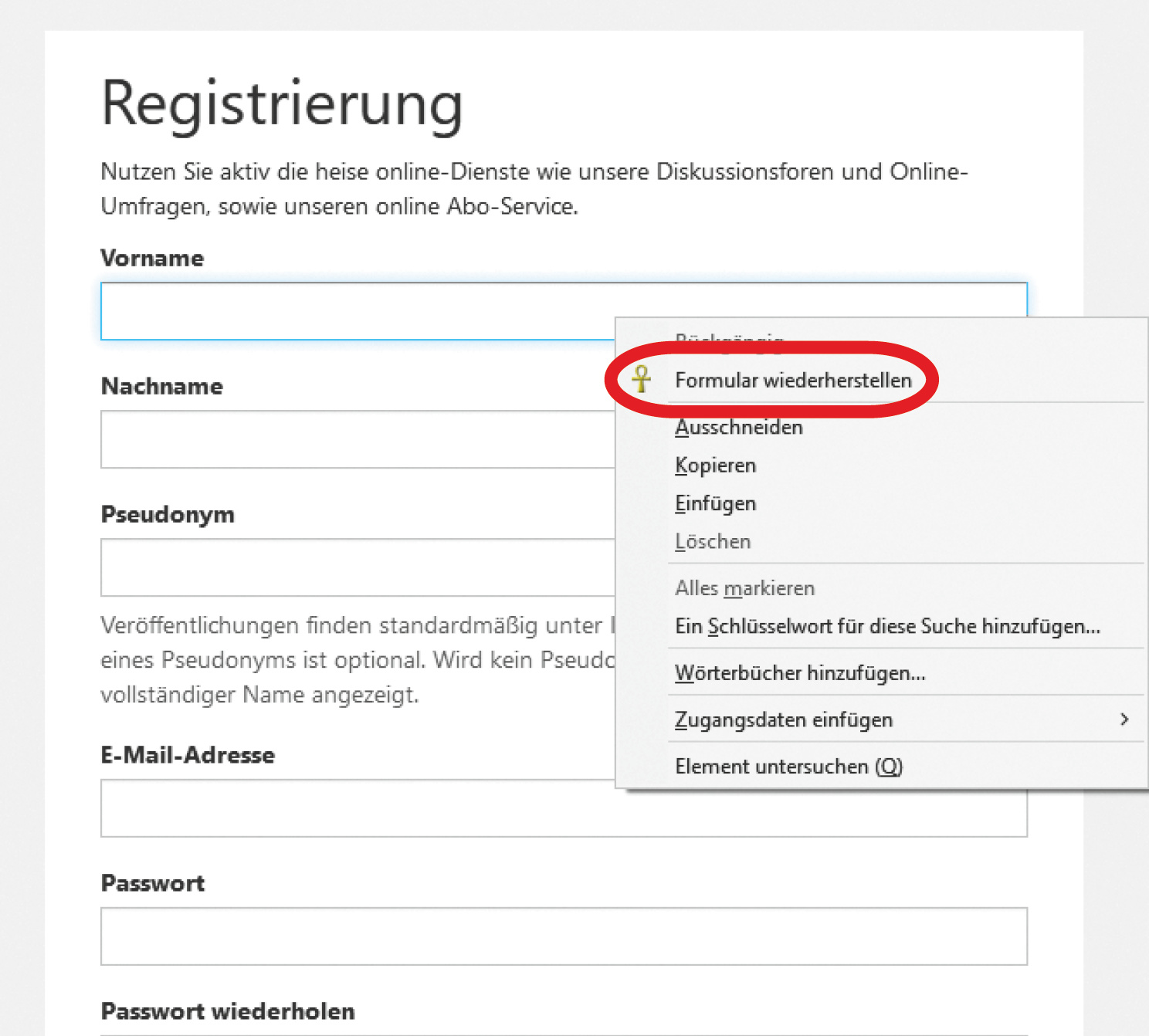 ¯!!! Für die Browser Firefox und Chrome gibt es das kostenlose Add-on „Lazarus Form Recovery“. Dieses speichert Eingaben in Formularen und stellt sie bei Bedarf wieder her. Wenn Sie versehentlich den Browser schließen oder die Seite wechseln, genügt ein erneuter Aufruf des BrowserFensters mit dem Formular. Klicken Sie mit der rechten Maustaste in das Feld. Im Kontextmenü wählen Sie „Text wiederherstellen“. Dort finden Sie die letzten Eingaben. Wählen Sie die gewünschte Version aus. Das funktioniert sogar nach einem Neustart des Rechners.