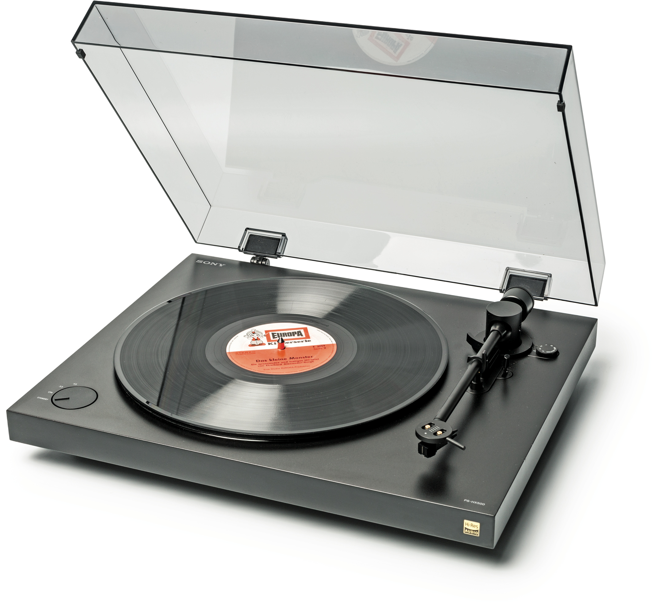 Sonys neuer Plattenspieler PS-HX500 kommt in einem zeitlos kantigen Design daher. Die Verarbeitung ist solide. Ein Riemenantrieb bewegt den Teller aus Aludruckguss mit 33 oder 45 Umdrehungen. Bei der Bedienung ist Handarbeit angesagt: Tonarmheber betätigen, manuell einschwenken und absenken. Eine Start-/Stopp-Automatik fehlt. Über ein Gegengewicht lässt sich der Tonarm ausbalancieren.
