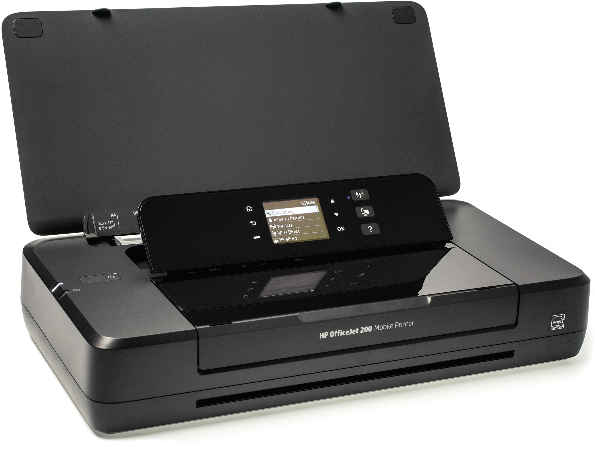 Der OfficeJet 200 gefällt mit seinem schlichten und funktionalen Design. Zusammengeklappt misst er nur 36 cm × 19 cm × 7 cm (Breite × Tiefe × Höhe), aber er wiegt knapp 2,3 Kilogramm – inklusive Akku und integriertem Netzteil. Der Ladezustand des wechselbaren Lithium-Ionen-Akkus lässt sich mittels einer Taste auf der Rückseite abfragen, ohne den Drucker einschalten zu müssen. Eine Akkuladung reichte im Test für gut 100 Druckseiten.