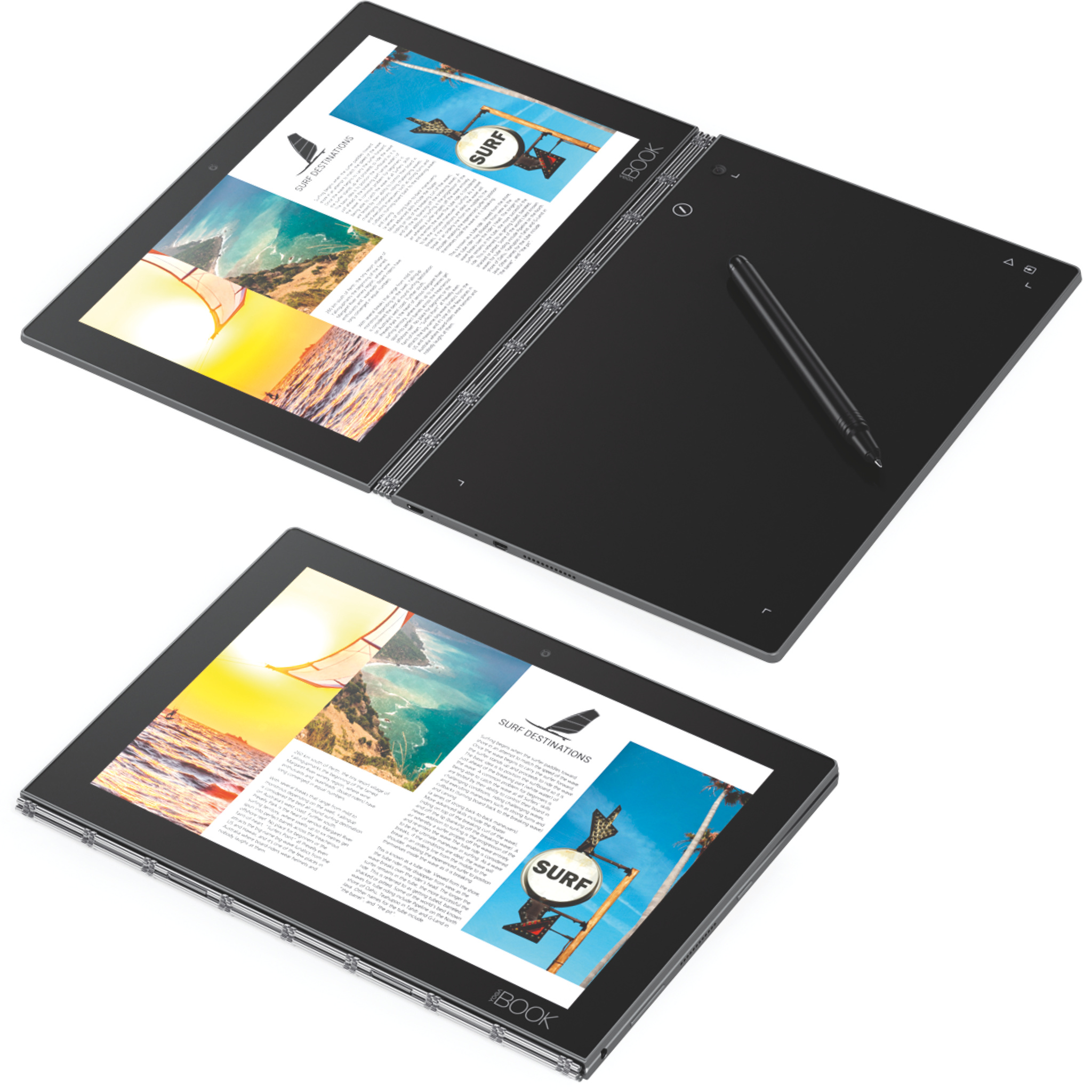 Anstelle einer Tastatur steckt im 2-in-1-Tablet Lenovo Yoga Book in der unteren Hälfte ein großes Eingabefeld. Für das liefert Lenovo einen induktiven Stift von Wacom mit, es kann aber auch ein Keyboard anzeigen und mit Fingern bedient werden. Umgeschaltet wird per Druck auf das Touchfeld oder automatisch, abhängig von der gestarteten App oder Stellung des 360-Grad-Scharniers. Beim Tippen vibriert das Pad, was zwar einen echten Tastenhub nicht ersetzt, aber genug Feedback fürs schnelle Schreiben lieferte.