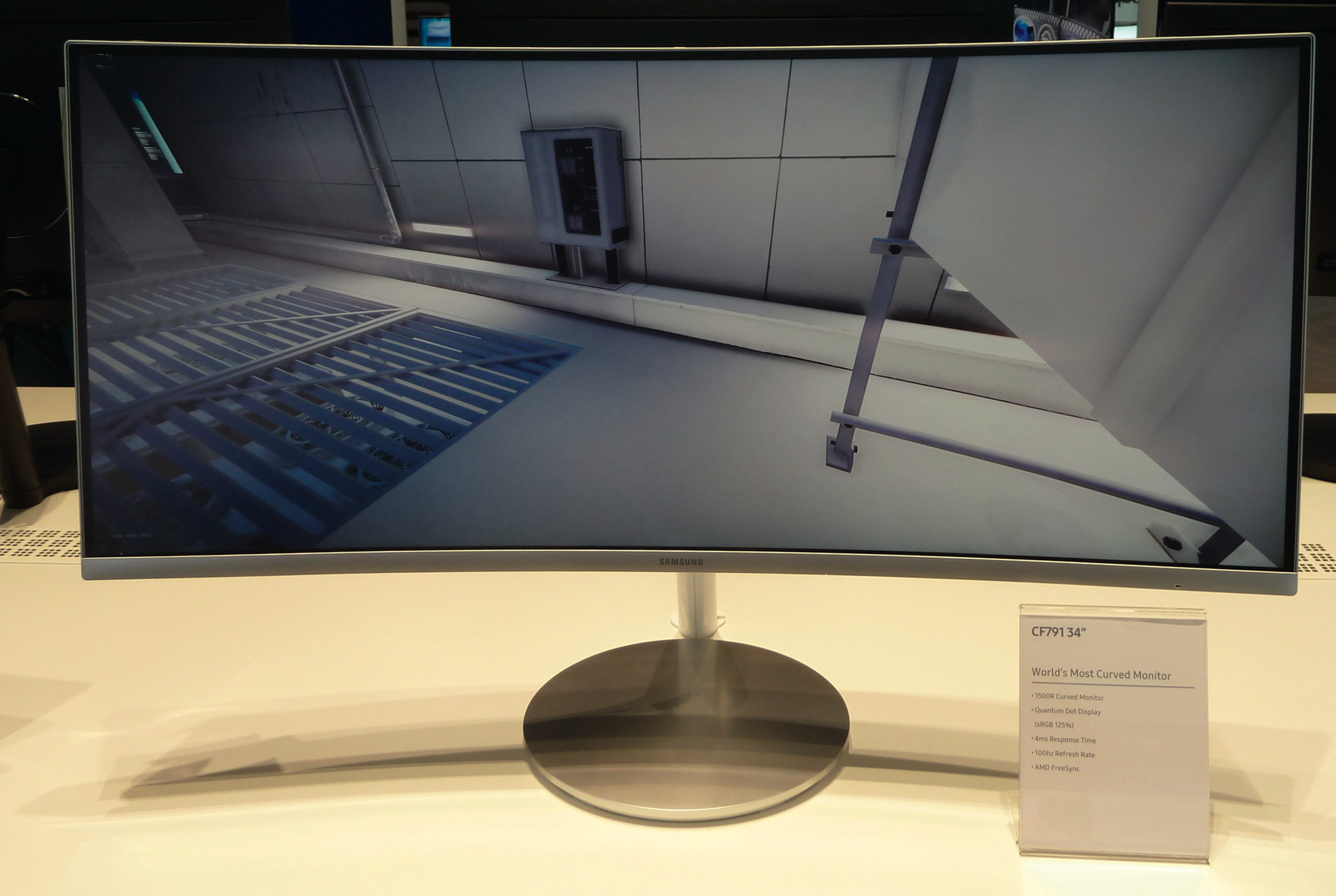 Der überbreite C34F791 mit 86 Zentimeter (34 Zoll) Diagonale hat 21:9-Format und zeigt Bilder mit 3440 × 1440 Bildpunkten an. Der Schirm besitzt einen Krümmungsradius von 1500R – wenn man mehrere Geräte aneinanderstellt, entsteht ein Kreis mit einem Radius von 1,50 Metern.