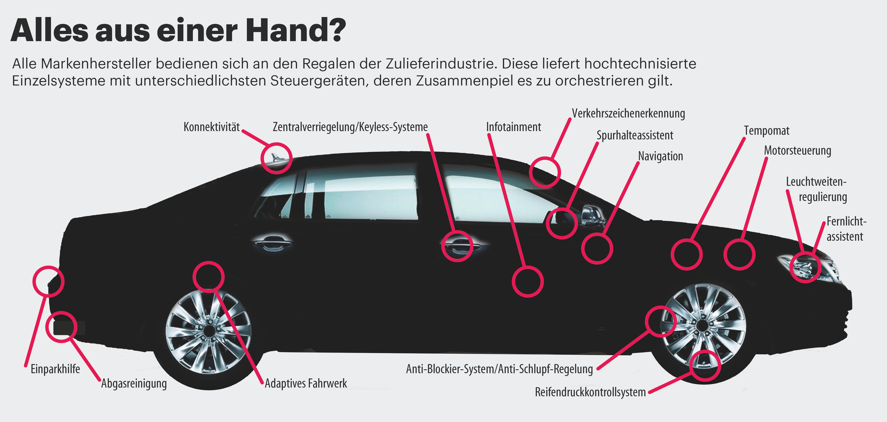 Das moderne Auto ist eine hochkomplexe IT-gesteuerte Maschine, in der Schätzungen zufolge rund 100 Millionen Codezeilen stecken [1]. Zum Vergleich: Die Steuerungssoftware für den Teilchenbeschleuniger des CERN hat nur halb so viele Programmzeilen. In den nächsten Jahren wird das Fahrzeug mit verschiedenen Cloud-Diensten vernetzt, die nicht nur vom Fahrzeughersteller, sondern auch von Automobil-Zulieferern, Infotainment-Diensten oder Kommunen betrieben werden. Viele der Entwicklungen stammen nicht von den Markenherstellern selbst – sie bedienen sich vielmehr nach dem Baukastenprinzip in den Regalen der Zulieferindustrie.