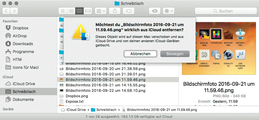 Die Funktion „Mac-Speicher optimieren“ entfernt bei Platzknappheit Dateien vom Mac, die bereits in der iCloud gesichert sind. Sie arbeitet aber offenbar nicht immer zuverlässig. Einem Bericht zufolge sei eine Audio-Datei vom Schreibtisch entfernt worden, obwohl sie mit Apples Logic Pro X bearbeitet wurde und obwohl der Speicherplatz nicht knapp gewesen sei. Die Optimierung lässt sich in den iCloud-Einstellungen unter „iCloud Drive“ im Bereich „Optionen“ abschalten.