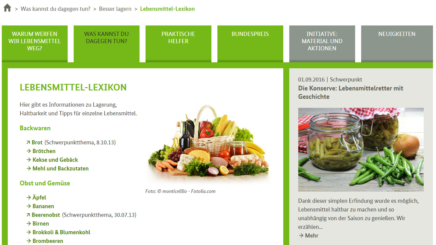 Mit ihrer Initiative Zu gut für die Tonne! macht die BLE auf dieses Problem aufmerksam, ohne allzu sehr den Zeigefinger zu erheben. Auf der Website zur Kampagne findet sich ein informatives Lebensmittellexikon mit Tipps zur Lagerhaltung beispielsweise von Obst- und Gemüsesorten oder Fleischprodukten. Sollten Tomaten in den Kühlschrank? Wie lange sind rohe Eier haltbar? Warum gehören Pilze nicht in eine Plastiktüte?