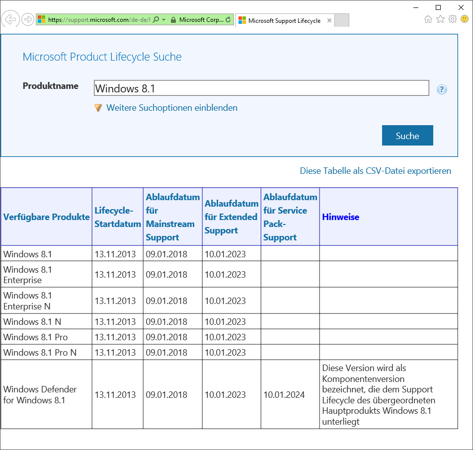 ¯!!! Ja. Nachlesen können Sie diese im sogenannten Lifecycle-Guide unter support.microsoft.com/de-de/lifecycle. Der war bei Redaktionsschluss allerdings in einem desolaten Zustand, es tauchten mitunter offensichtlich falsche Daten auf wie „01.01.1900“ und andere fehlten ganz. Microsoft konnte uns bis Redaktionsschluss nicht sagen, wann das wieder repariert ist. Auf der gleichen Website gibt es auch eine umfangreiche FAQ. (axv@ct.de)