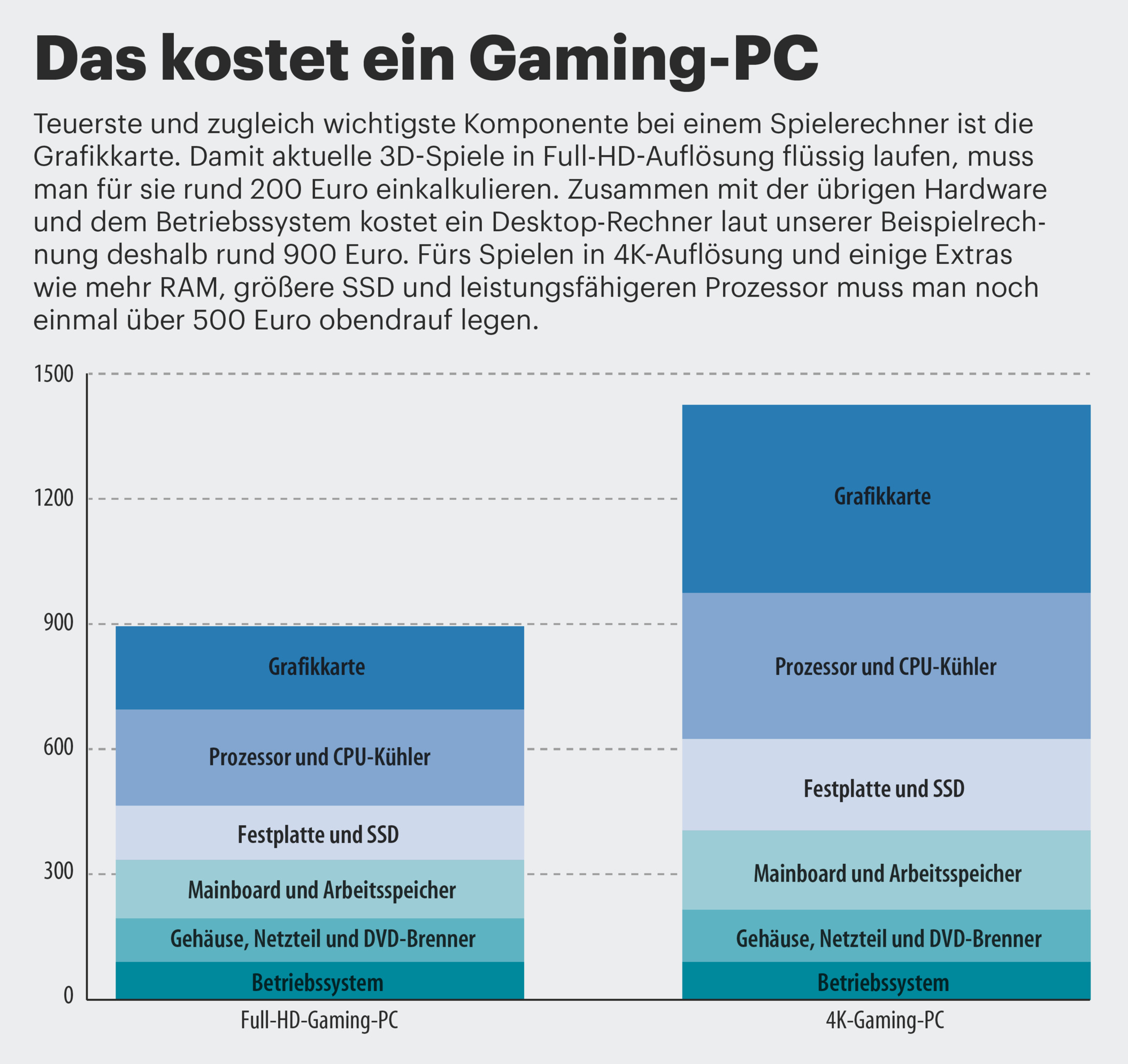 Der Einstieg in die Spielwelt beginnt mit rund 600 Euro für Desktop-Rechner, die zumindest fürs Zocken in 720p-Auflösung reichen. „Gaming-PCs“ für weniger Geld entpuppen sich meist nur als vermeintliches Schnäppchen, denn ihnen fehlt eine Grafikkarte, die das Prädikat „spieletauglich“ wirklich verdient. Die Karten schon kurz nach dem Kauf für mehrere Hundert Euro zu ersetzen lohnt in den allerwenigsten Fällen, zumal durch den Umbau die Herstellergarantie für das Komplettsystem entfällt.