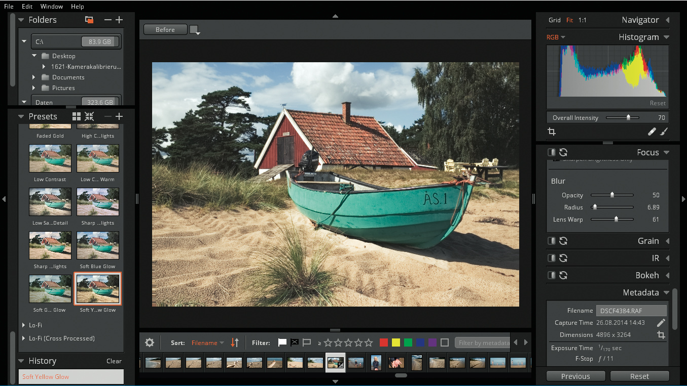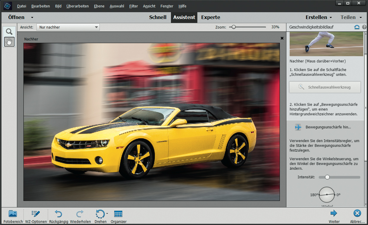 In Photoshop Elements 15 lässt sich die Darstellung von Mund, Nase, Augen und Gesichtsform in Porträts genauso wie in der aktuellen Photoshop-Version mit Reglern bearbeiten. Ein neuer Assistent ergänzt Bewegungsunschärfe, beispielsweise um Fotos von Sportwagen die Anmutung von Geschwindigkeit zu geben. Ein weiterer Assistent erstellt Beschnittmasken aus Schriftzügen, sodass die Buchstaben ein hinterlegtes Foto zeigen können. Die Schriftzüge ergänzt das Programm um Relief- und Schatten-Effekte.