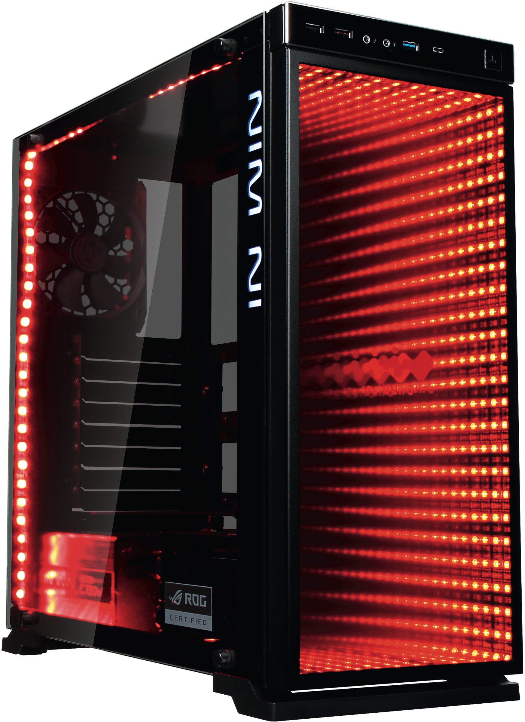 Das PC-Gehäuse In Win 805i hebt sich durch eine verspiegelte, von RGB-LEDs beleuchtete Glasfront von anderen Midi-Towern ab. Durch Kombination eines Einweg- und eines vollreflektierenden Spiegels entsteht der Eindruck räumlicher Tiefe. Per Windows-Software und internem USB-Anschluss lassen sich Farbe sowie Blink- oder Pulsmuster der LEDs einstellen.