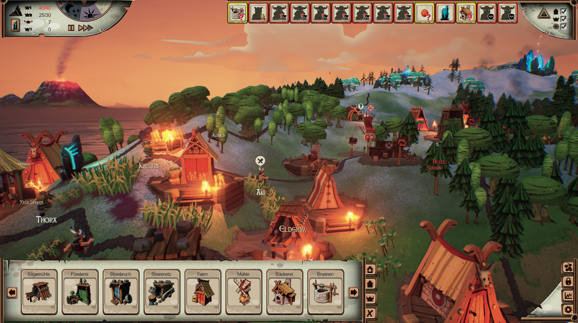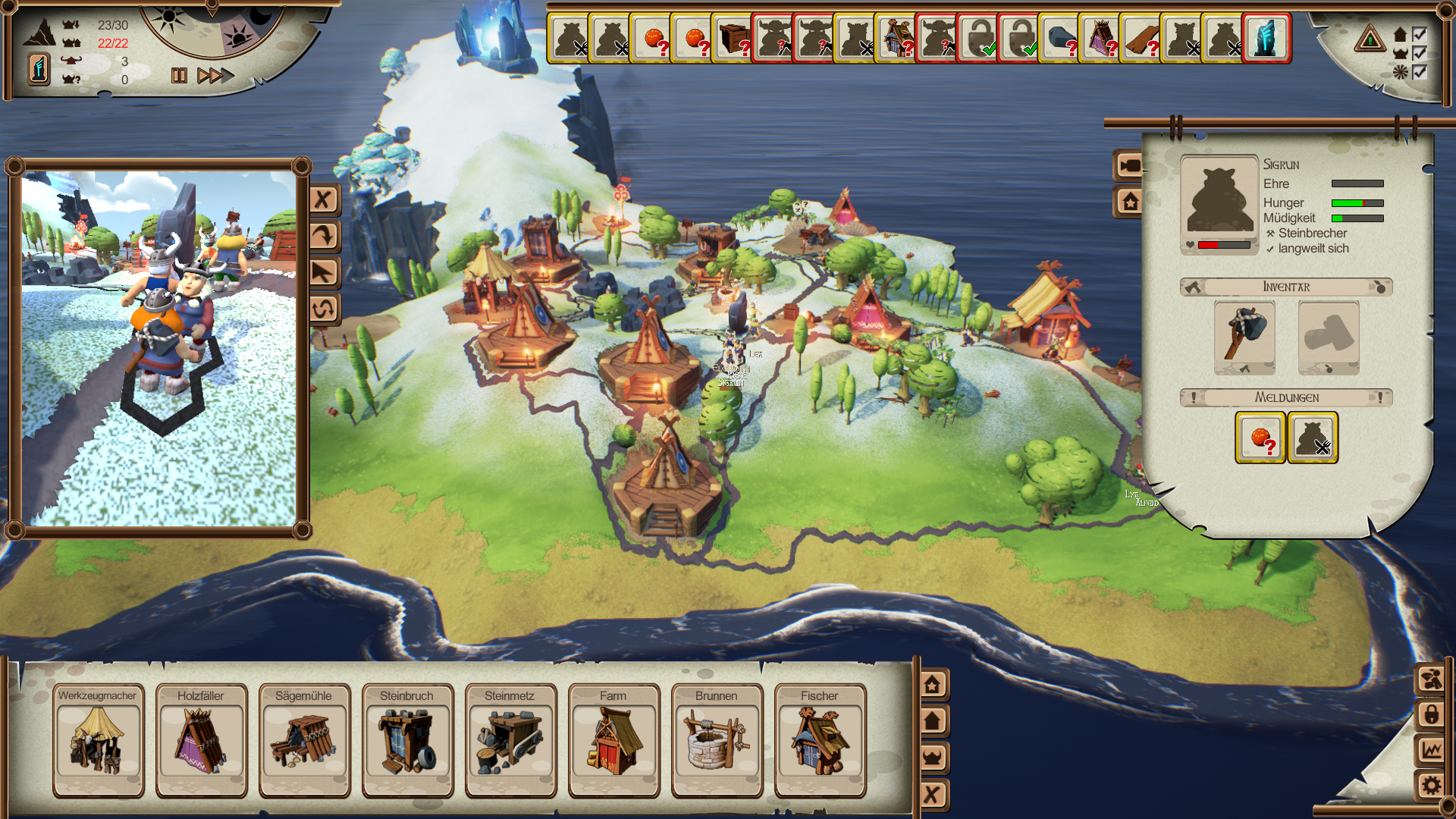 Thomas Häuser, einst bei Blue Byte federführend an „Die Siedler II“ beteiligt, hebt mit seinem jetzigen Entwicklerstudio Funatics 20 Jahre danach ein Aufbauspiel aus der Taufe, das eine ganz ähnliche Klientel anspricht. Auch diesmal spielt der vielzitierte Wuselfaktor eine wichtige Rolle. Allerdings findet sich bei Valhalla Hills statt Schrägdraufsicht und Miniaturdesign eine freie Kameraperspektive, die den Spieler in grafischer Pracht schwelgen lässt. Die Heimat der Wikinger sind per Zufall erzeugte Inseln mit einem Portal an der Spitze. Hat der Stamm genügend „Ehre“ angesammelt, lässt das Portal sich öffnen und ruft Gegner herbei – diese kann man entweder besiegen oder mit Opfergaben besänftigen.
