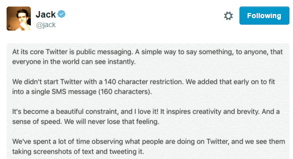 Wer bei Twitter viel zu sagen hat, muss lange Texte als Screenshot veröffentlichen: Pro Tweet sind nur 140 Zeichen erlaubt. Das ist viel zu wenig, findet der Twitter-Mitgründer und -Chef Jack Dorsey. In einem längeren Text, den er demonstrativ als Bilddatei bei Twitter veröffentlichte, argumentierte er für eine Aufhebung der Limitierung. Richtige Texte könnten die Nutzer durchsuchen, markieren und kopieren.