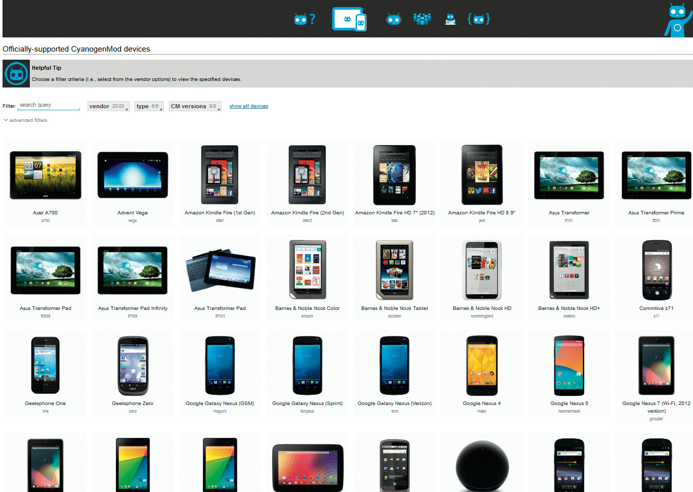 !!! Ob es für das eigene Smartphone oder Tablet eine offizielle CM-Version gibt, findet man flink auf der offiziellen Webseite wiki.cyanogenmod.org/w/Devices heraus. Entweder nutzt man den Suchfilter oder man lässt sich mit einem Klick auf „show all devices“ eine Liste anzeigen. Weit verbreitete Geräte wie die Topmodelle Samsung Galaxy S oder ehemalige Schnäppchen wie das Google Nexus 5 oder LG G2 haben bessere Chancen auf eine eigene CM-Version als Exoten. Generell unterstützt CM deutlich mehr Smartphones als Tablets, was ebenfalls an der Verbreitung liegt.