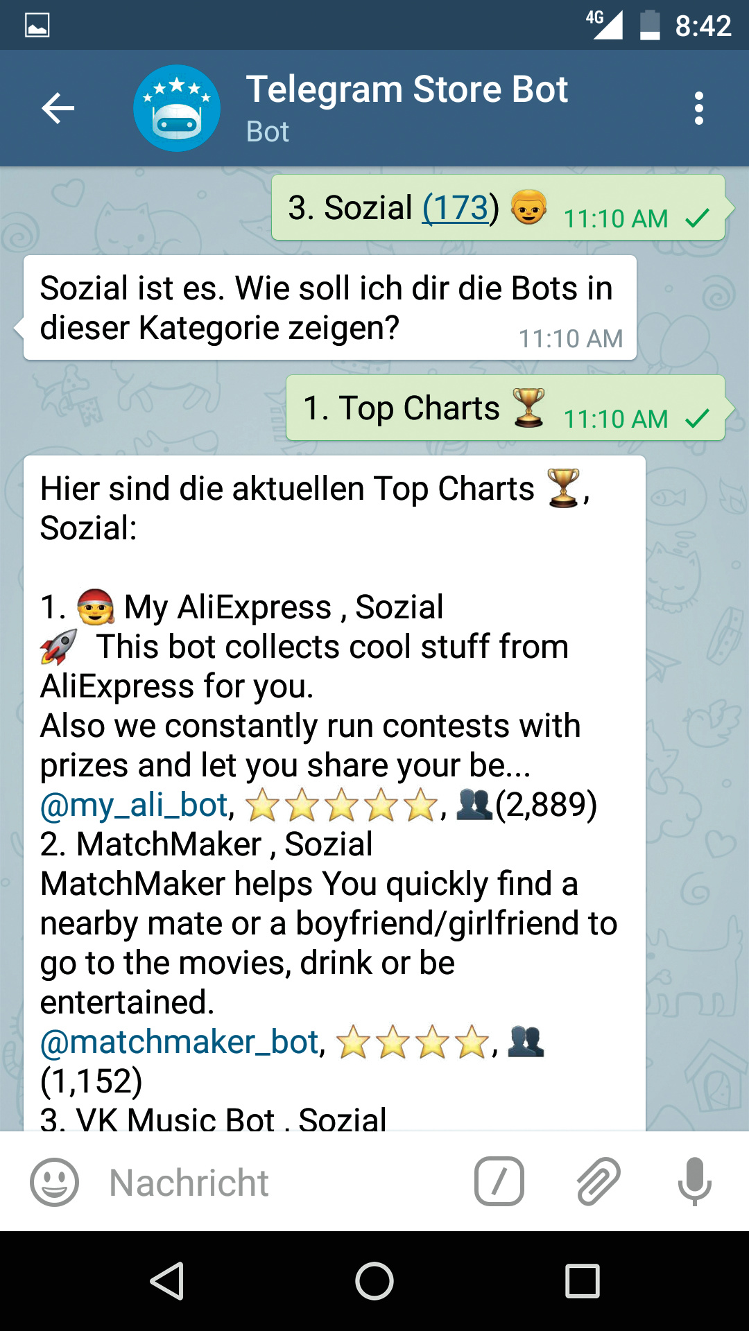 So kann man zum Beispiel mit dem MyPokerBot eine Partie Texas Holdem Poker spielen; der GitHub-Bot informiert den Benutzer über Ereignisse in seinen öffentlichen Repositorien. Telegram betreibt sogar einen Bot, der dem Benutzer hilft, durch die Auswahl zu navigieren, die hunderte Bots umfasst.