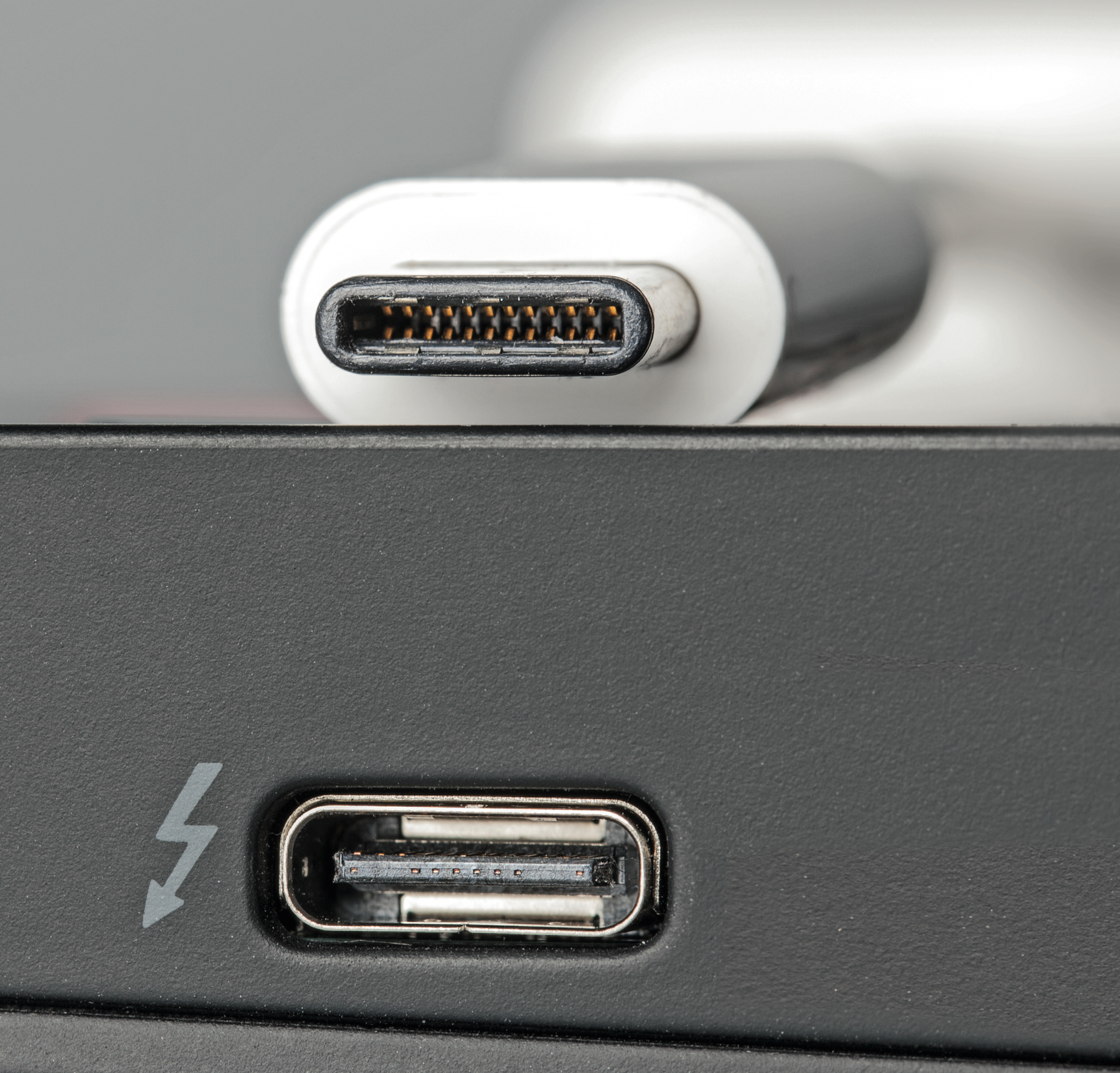Aber der Reihe nach. Die USB-Spezifikation für die Steckverbinder vom Typ C beschreibt nicht nur Datenverbindungen für USB 2.0 (Low-, Full- und Highspeed) sowie die schnelleren 3.0- und 3.1-Modi (SuperSpeed, SuperSpeedPlus), sondern auch sogenannte „Alternate Modes“. Dabei werden einige der insgesamt 24 Kontakte für andere Verbindungen umgewidmet. Einer davon ist DisplayPort für den Anschluss von Monitoren. So kann die reguläre Grafikeinheit eines Gerätes auch externe Monitore versorgen, anders als bei älteren USB-Monitor-Adaptern und -Docking-Stationen, wo im Adapter ein eigener Grafikchip saß, der eigene Treiber erforderte.