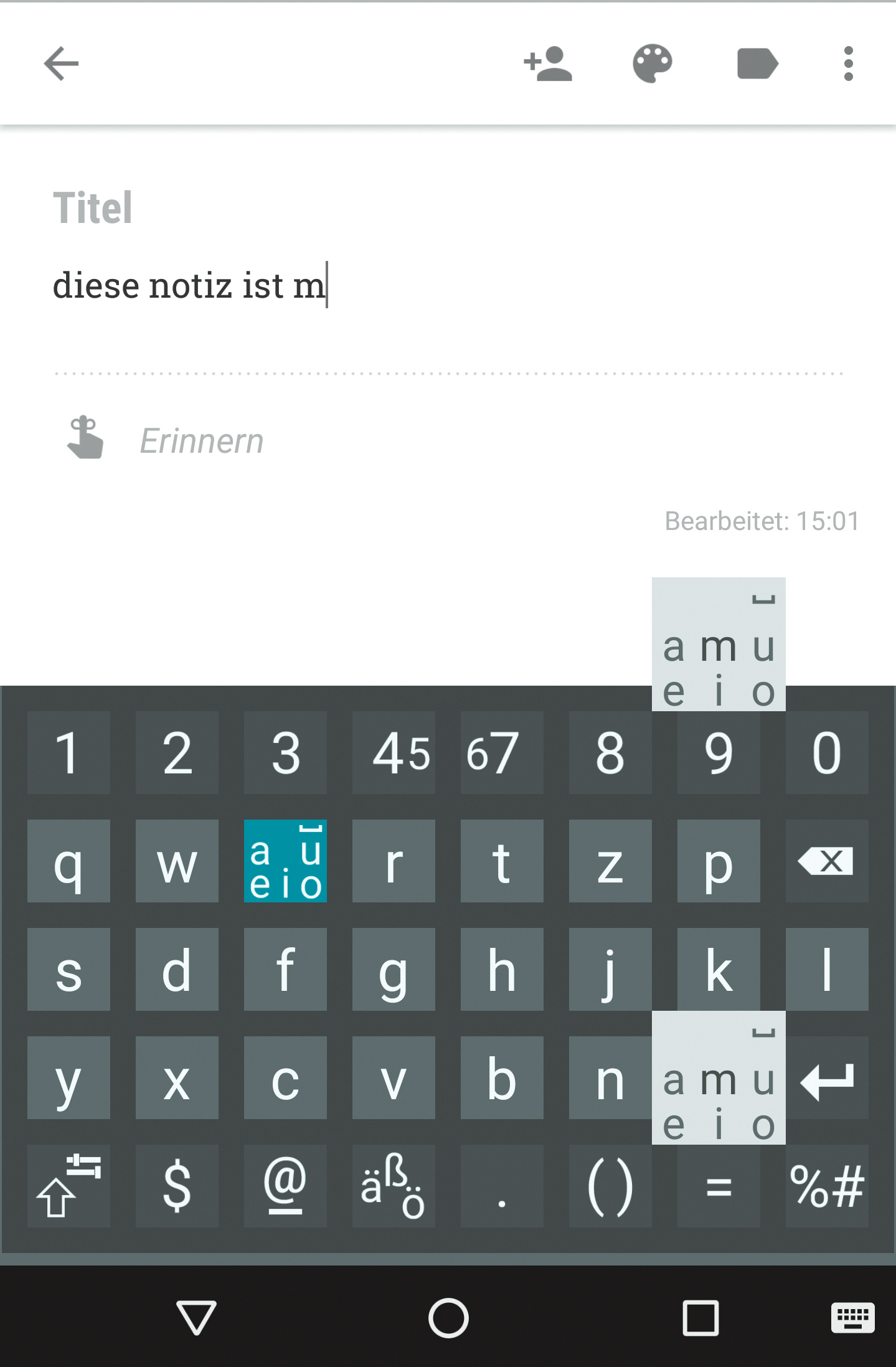 Die virtuelle Tastatur für Smartphones arbeitet mit einer Art Silbensystem: Statt auf einen Buchstaben zu tippen wischt man von dort aus in verschiedene Richtungen und erzeugt so Silben. Der Wisch von „t“ aus etwa nach links schreibt die Silbe „ta“, der Wisch nach rechts dagegen „tu“. Mit diesem ungewöhnlichen System schafft man deutlich mehr Anschläge pro Minute, muss sich allerdings – um einiges länger umgewöhnen als bei Wischtastaturen wie Swype oder Swiftkey.