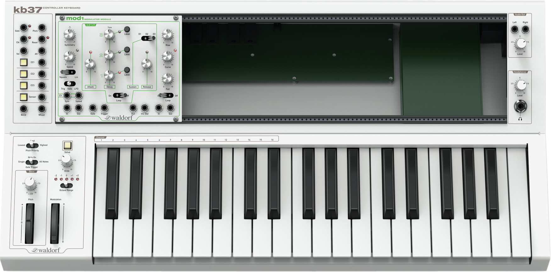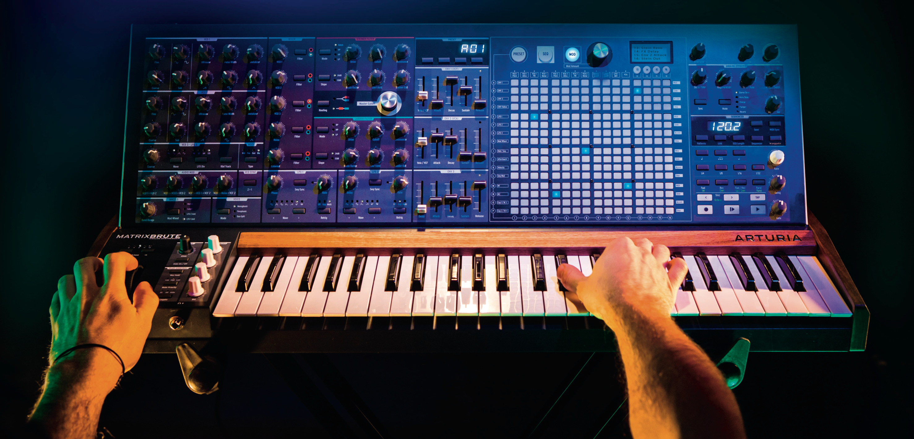Gut den dreifachen Preis von rund 2000 Euro ruft Arturia für seinen MatrixBrute mit 49 Tasten in voller Größe auf. Dieser spielt zwar nur monophon (beziehungsweise paraphon), erlaubt es aber, die einzelnen Module der Klangerzeugung über eine 16×16-Schaltmatrix frei zu verknüpfen. Die Matrix lässt sich aber auch zur Programmierung des internen Sequencers nutzen. Drei Oszillatoren und zwei Filter (Steiner-Parker, Ladder), drei LFOs und Envelopes erlauben wilde Klangexperimente. Ebenso wie die komplette Klangerzeugung ist auch die Effekt-Sektion (Delay, Chorus, Flanger) rein analog aufgebaut. An der Rückseite finden sich neben den Audio-, MIDI- und USB-Buchsen auch 12 CV-Ein- und Ausgänge, sodass der MatrixBrute auch andere Synthiemodule steuern kann.