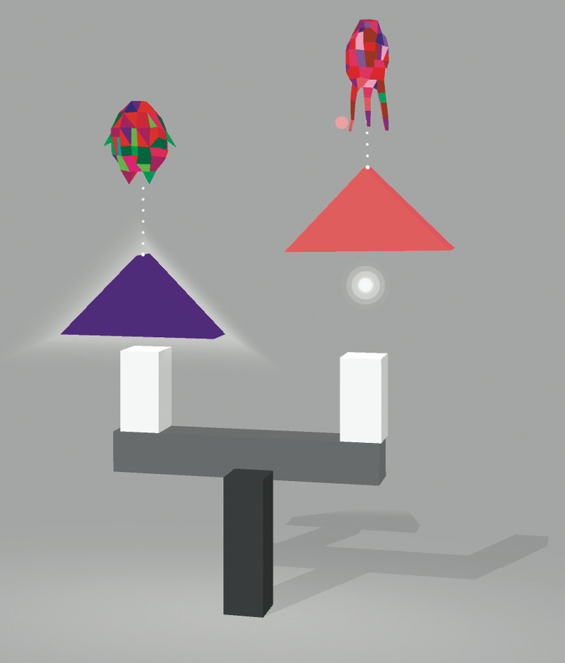 Ziel und Steuerung sind simpel. In der Rolle eines schwebenden bunten Fetzenwesens stapelt man geometrische Objekte vor einem neutralen Hintergrund aufeinander. In irgendeiner Höhe ist stets ein leuchtender Punkt fest angebracht. Wenn die Türme diesen Punkt erreichen, ist ein Puzzle gelöst. Manche der Level kann man allein schaffen, andere hingegen benötigen einen oder gar zwei Mitspieler. Sie werden vom System zugewiesen – es ist nicht möglich, gezielt jemanden einzuladen.