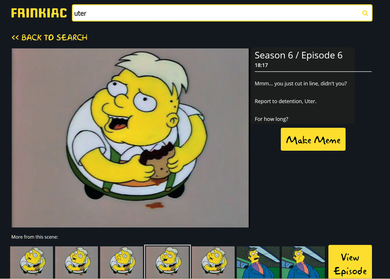 Simpsons-Fans aufgepasst: Frinkiac enthält die kompletten Dialoge und fast drei Millionen Screenshots aus den Staffeln 1 bis 15. Das gigantische Archiv lässt sich bequem durchsuchen: Man tippt einfach ein Schlagwort oder ein Zitat ein und bekommt sofort alle Szenen angezeigt, in denen eine der Figuren die gesuchten Wörter ausspricht. Fragen wie „In welchen Folgen taucht der deutsche Austauschschüler ‚Uter’ auf?“ oder „Wo ist noch mal die Szene, in der Lisa Ralphs Herz bricht?“, sind damit schnell beantwortet.