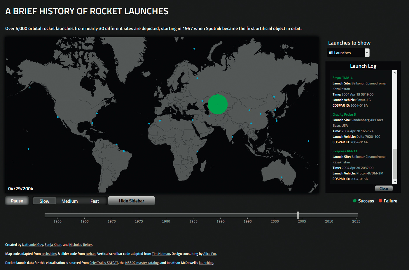 A Brief History of Rocket Launches visualisiert die Geschichte der Raumfahrt: Die Webseite zeigt sämtliche Starts von Weltraumraketen von 1957 bis 2015. Man erfährt, von welchen Weltraumbahnhöfen die Raketen starteten, welche Sonden und Satelliten an Bord waren und ob die Missionen erfolgreich endeten. Man kann den Datensatz auch nach Zielen wie „Mars“, „Mond“ oder „Outer Space“ sowie nach Projekten wie „Space Shuttle“ und „Space X“ filtern. (cwo@ct.de)
