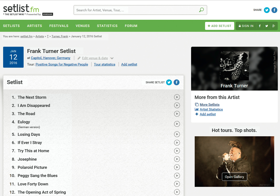 Im ansprechend gestalteten Wiki sammeln tausende Nutzer die Setlists großer und kleiner Konzerte, und zumindest von den populären Bands sind häufig die kompletten Tour-Infos penibel Song für Song eingetragen. Der Fundus ist riesig: Beatles-Auftritte aus den 60er Jahren sind ebenso sauber protokolliert wie Straßenkonzerte der österreichischen Newcomer-Band Wanda.