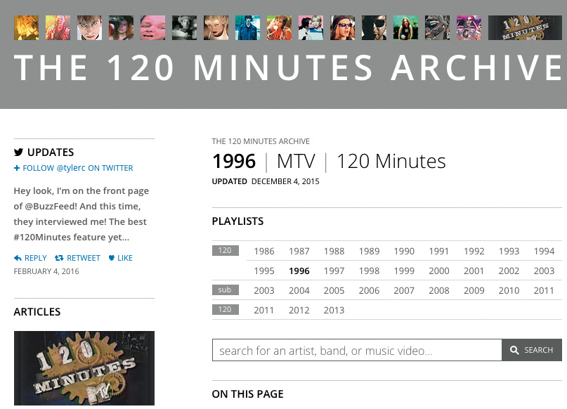 Die Fernsehshow „120 Minutes“ stellte von 1986 bis 2003 auf MTV in den USA alternative Musik vor. Danach wurde sie vom Nachfolger Subterranean abgelöst. Im Jahr 2011 kehrte „120 Minutes“ auf MTV2 zurück. Die Webseite The 120 Minutes Archive veröffentlicht die Playlists aller Shows von 1986 bis heute, geordnet in die drei Kategorien 120 (1986 bis 2003), Sub (2003 bis 2011) und wieder 120 (2011 bis 2013).