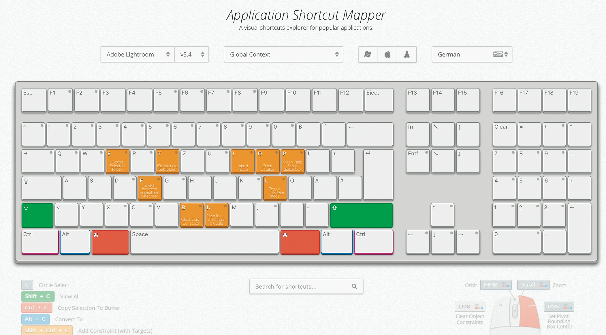 Shortcut Mapper ist die Online-Version eines solchen Ausdrucks: Man wählt das Programm aus einer Liste sowie die verwendete Version und das Betriebssystem (Windows, OS X oder Linux). Ein Druck auf Sondertasten blendet die Funktionen auf der dargestellten Tastatur ein. Shortcut Mapper kennt etliche Programme von Adobe und Autodesk, außerdem Blender, SketchUp, Entwicklungs-Tools von Jetbrains und einiges mehr. (ad@ct.de)
