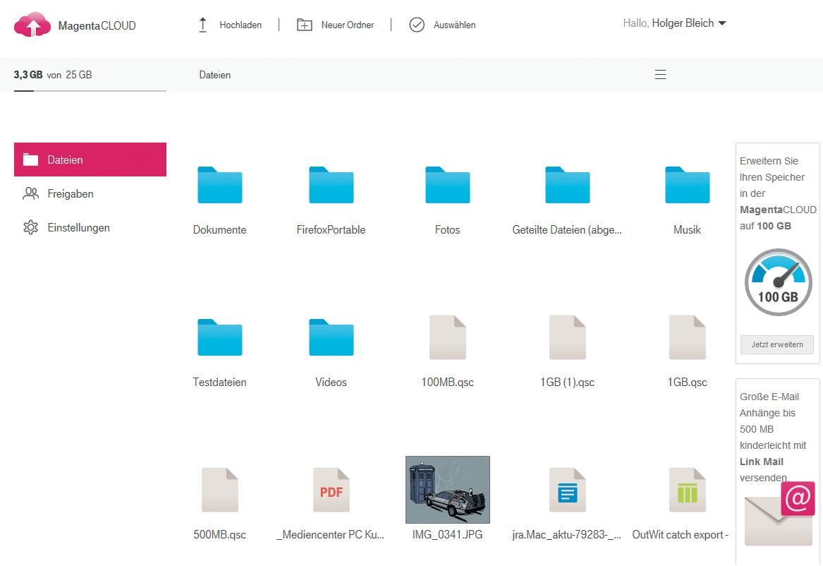 Das „Telekom-Mediencenter“ heißt jetzt „MagentaCloud“ und ist um zeitgemäße Funktionen ergänzt. Die wichtigste: Endlich dürfen Kunden nicht nur einzelne Dateien, sondern ganze Ordner ihres Speichers freigeben – wahlweise auch mit Schreib- und Löschrechten. Ein integriertes Backup sichert nun täglich alle geänderten Dateien, der Platz dafür geht allerdings vom freien Speicher ab. Per Voreinstellung hält die MagentaCloud die Sicherungen drei Monate vor, was der Nutzer auf minimal eine Woche reduzieren kann.