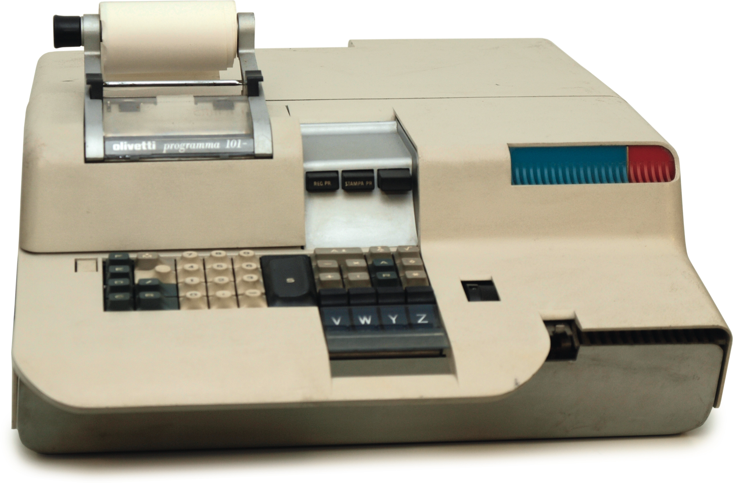 Der LINC war ein Vorläufer des ersten Personal Computer, doch der kam dann ausnahmsweise nicht aus den USA – sondern 1965 aus Italien: die Olivetti Programma 101. Okay, sie war zwar eher ein programmierbarer Tischrechner als ein PC, aber mit interessanter Laufzeit-Speichertechnik: seriell über Magnetdrähte. Eine Art Tonkopf speiste dabei für jedes der 10 Register die 22-stelligen Zahlen seriell ein und las sie nach kurzer Verzögerungszeit am Ende wieder aus. Als Permanent-Speichermedium kamen Magnetkarten zum Einsatz.