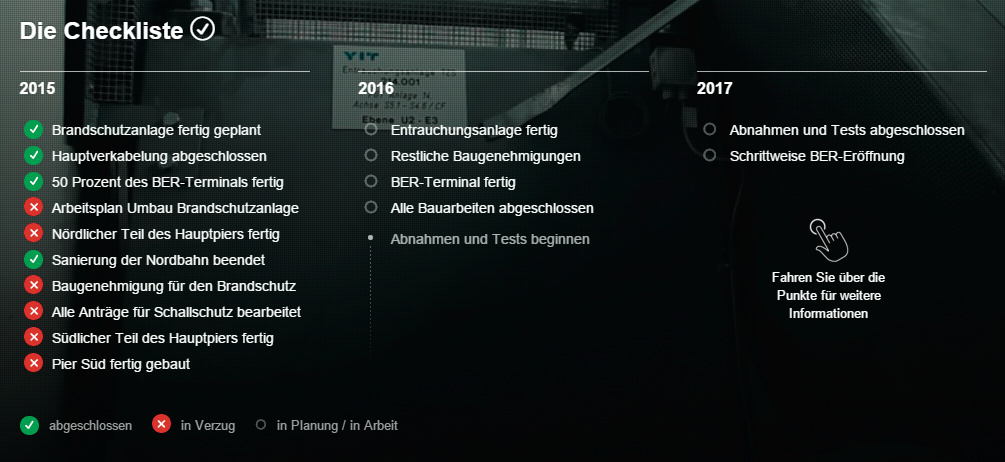 Die Berliner Morgenpost, die Ist der BER schon fertig? betreibt, könnte es sich einfach machen und einfach ein großes „Nein“ hinschreiben. Die Site liefert aber ein detailliertes Bild des Baufortschritts beim Berliner Flughafen. Sie präsentiert eine Checkliste, welche Bauschritte 2015, ’16 und ’17 abgeschlossen sein soll(t)en – und welche davon bis dato bereits im Verzug sind. Dazu zeigt sie eine Chronologie der wichtigsten Meldungen zum Thema aus dem letzten Jahr. Fensterfüllende, atmosphärische Videos von der Baustelle im Hintergrund runden die informative Site ab. (jo@ct.de)