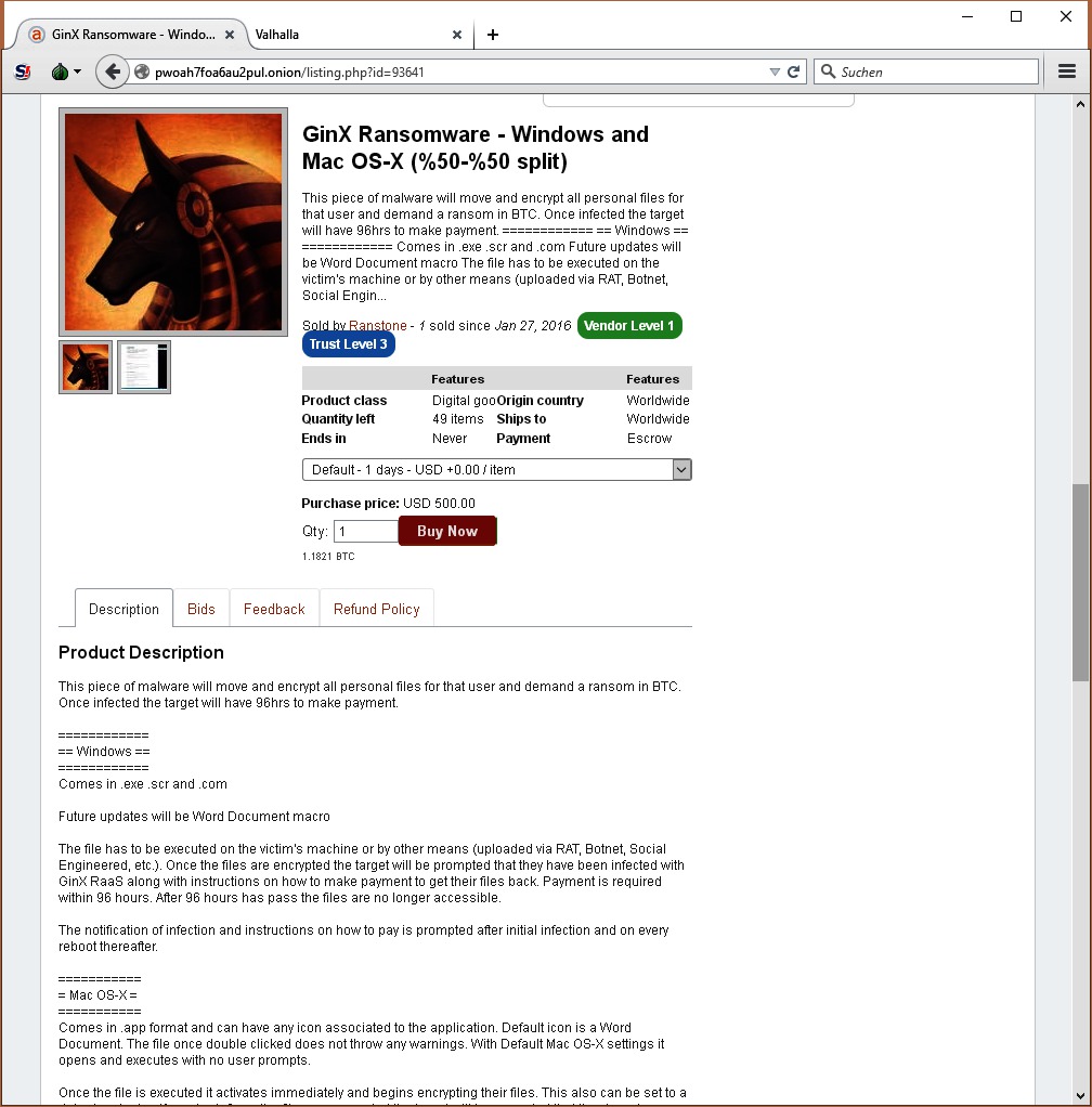 Einige Verkäufer gehen noch weiter und bieten unterschiedliche Verbreitungswege mit an. So können Kriminelle etwa Spam-Mails oder Exploit-Kits dazuzukaufen, die den Krypto-Trojaner an die Opfer ausliefern.